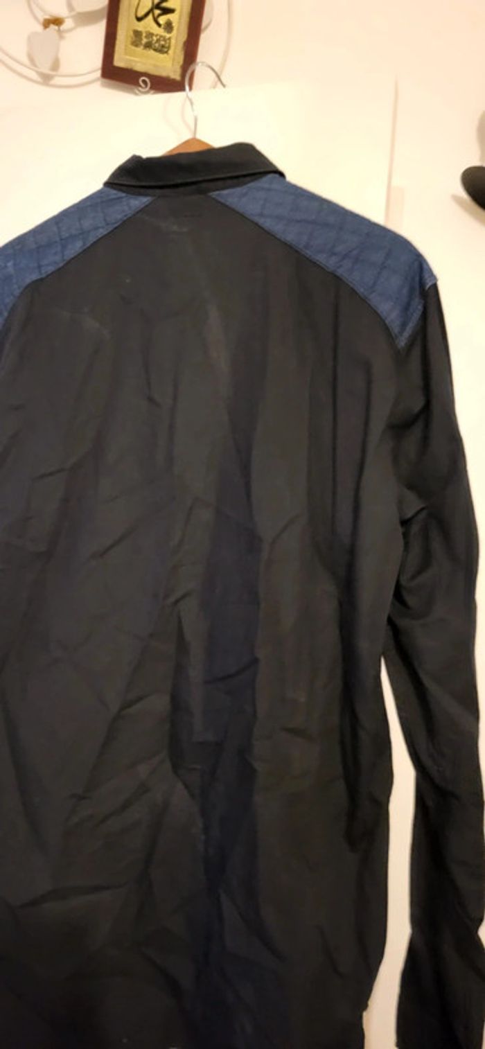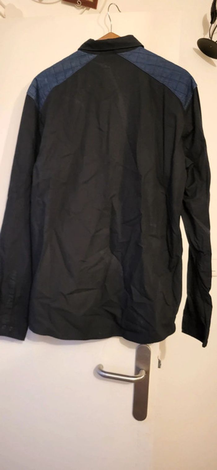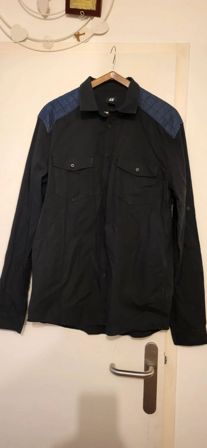 Magnifique chemise noir homme avec motif matelassé aux épaules. En parfait état. 100% coton. H&M. Taille L. Epaule à epaule à plat : 50cm Aisselle à Aisselle : 48cm Taille à plat : 55cm Longeur total : 76cm #echelon18L