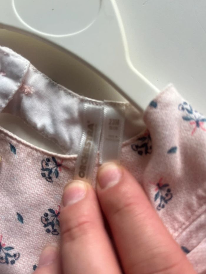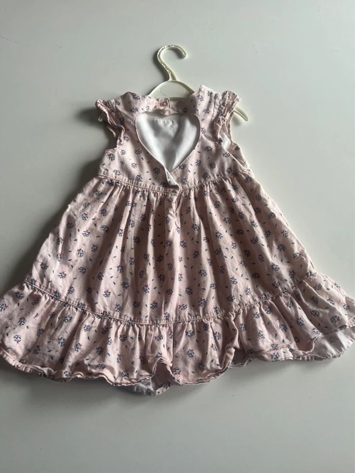 Magnifique robe rose pâle avec un motif fleuri et un dos nu en forme de cœur. Porté 2 fois. Marque: orchestra Taille: 23mois (86cm)