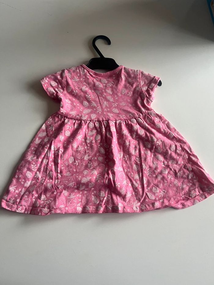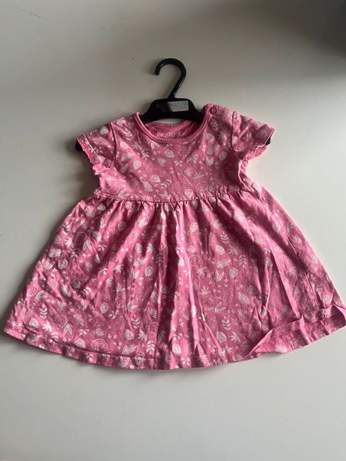 Joli robe rose avec des petits fruits en très bon état. Marque: inextenso Taille: 74 cm (9mois)