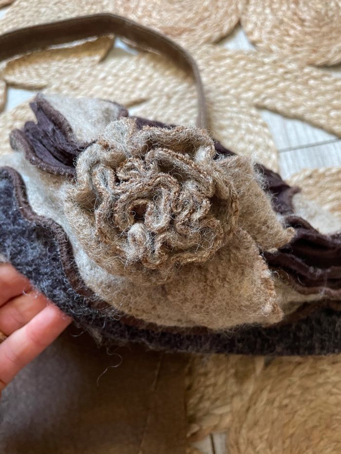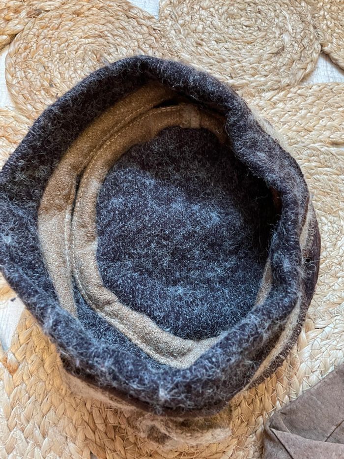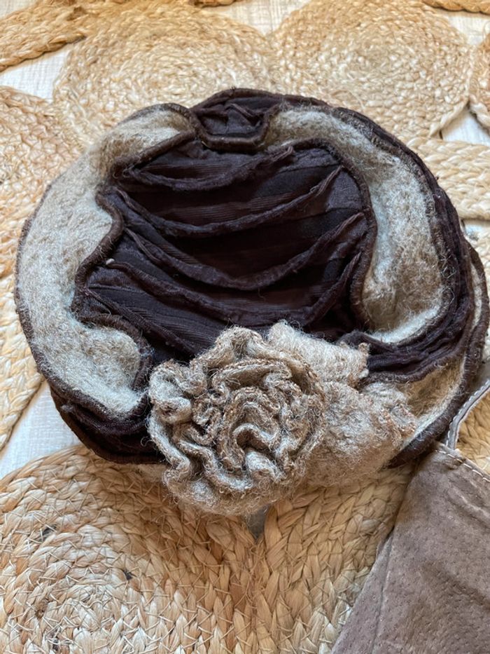 joli chapeau en laine feutrée, marron et beige ornée d'une fleur