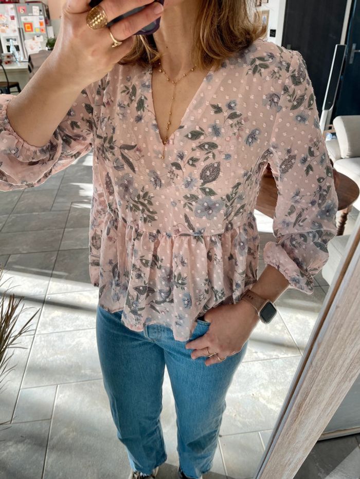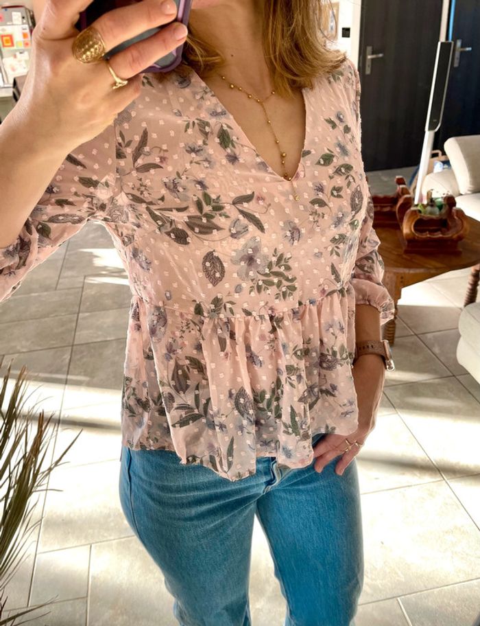 Chemisier léger rose pale motifs floraux et pois tuftés manches bouffantes Style bohème