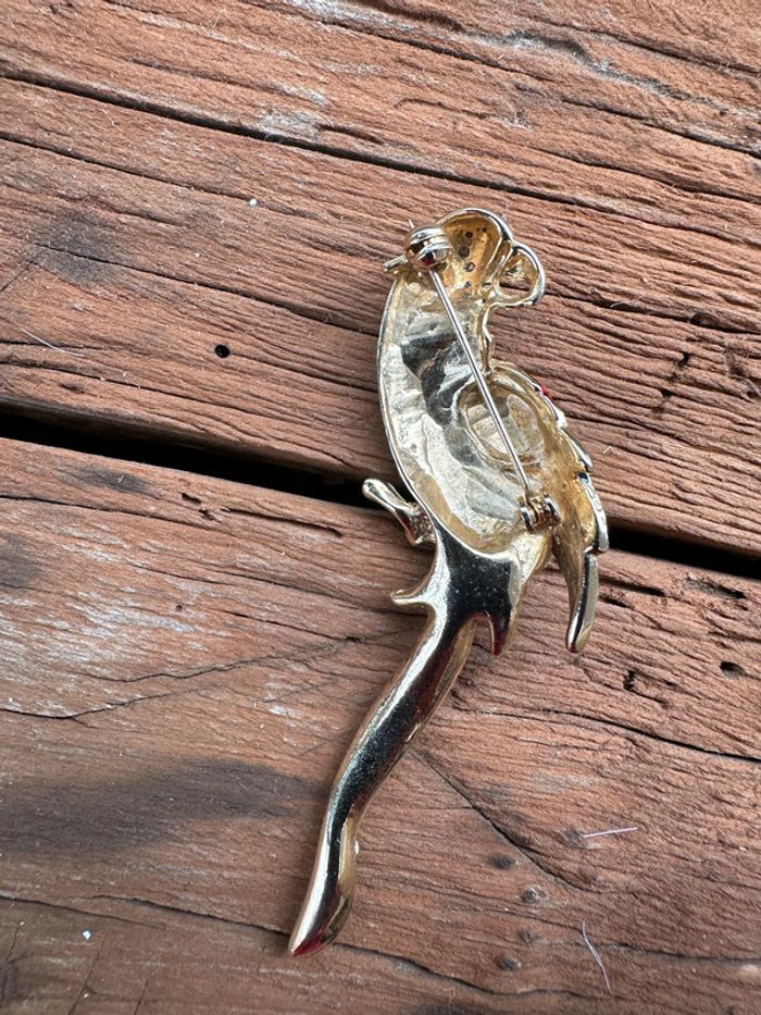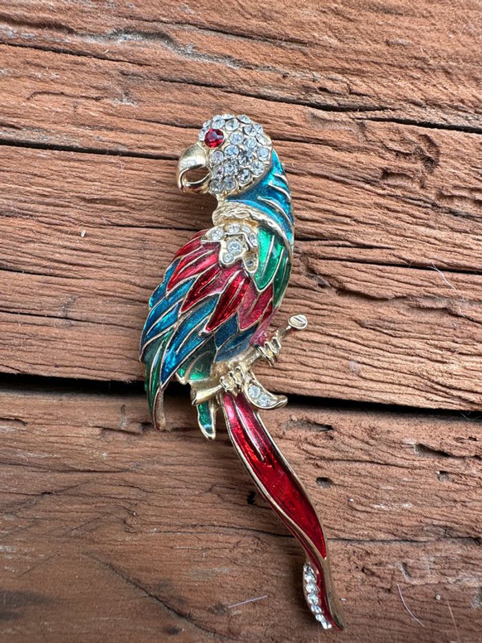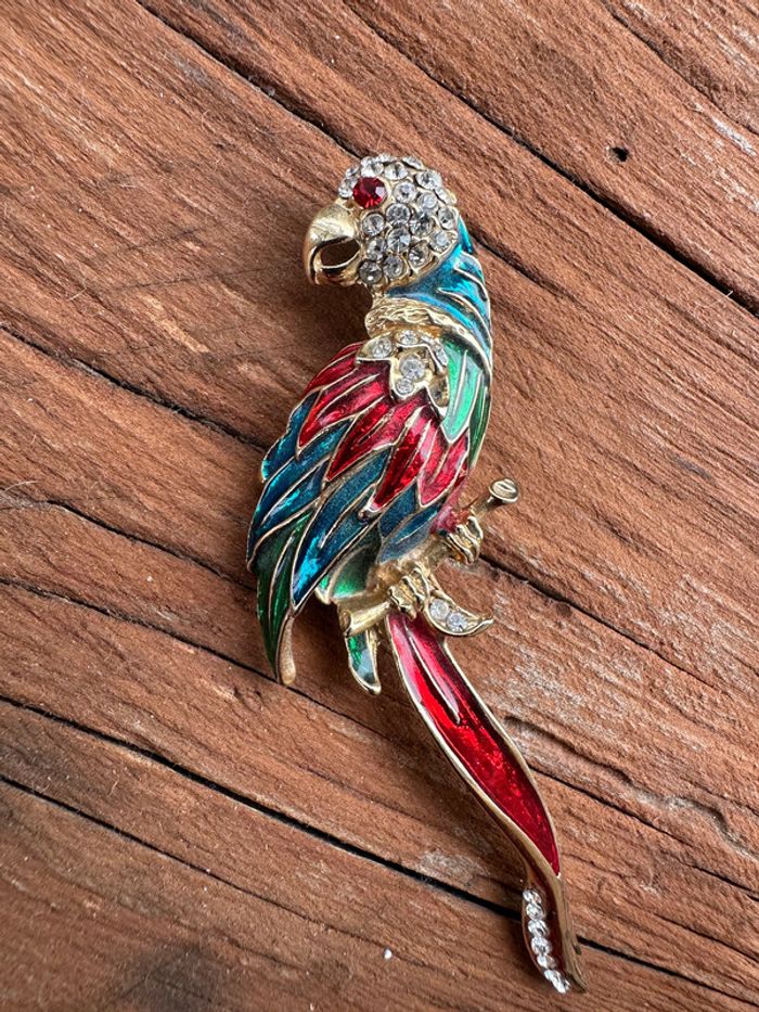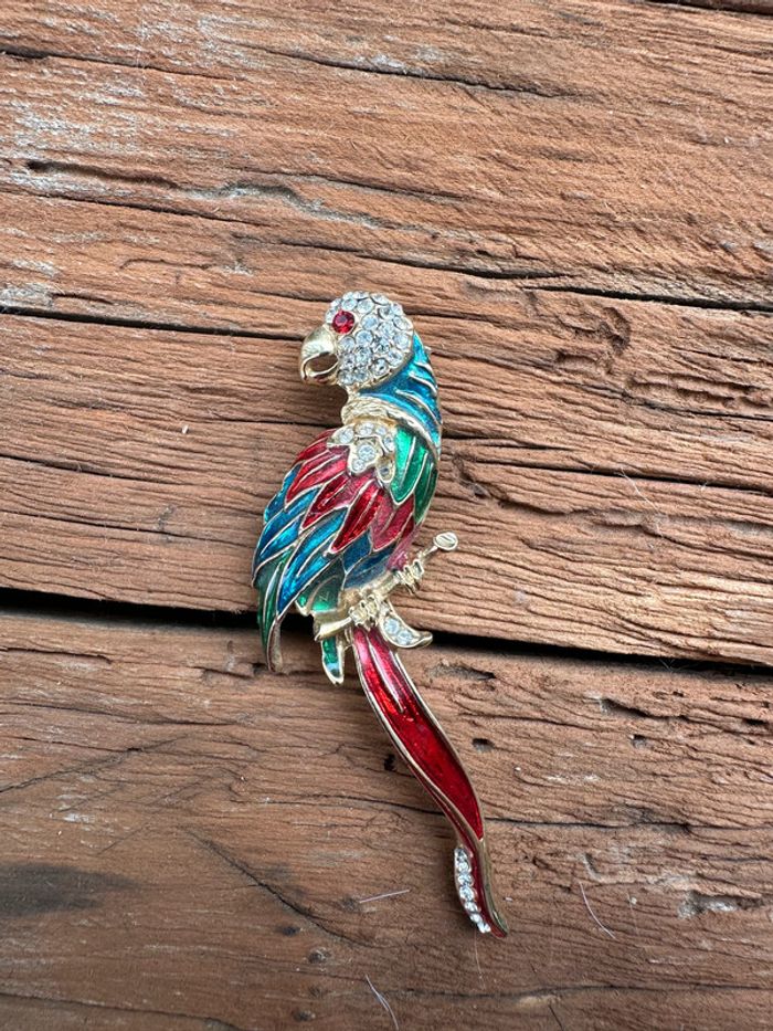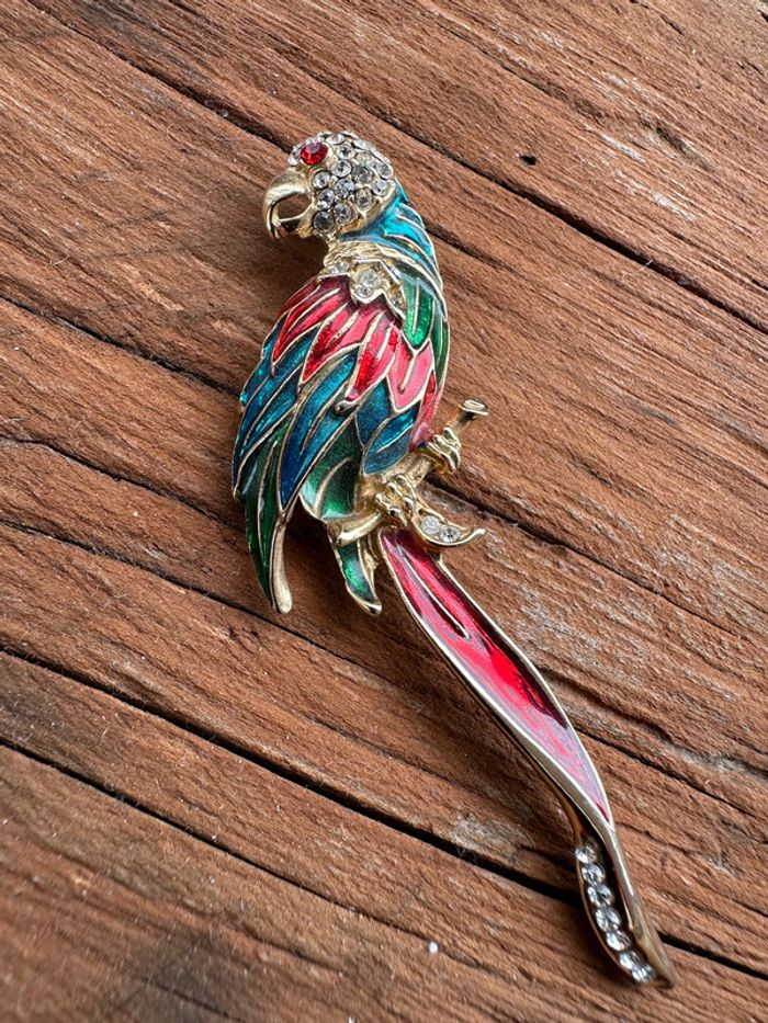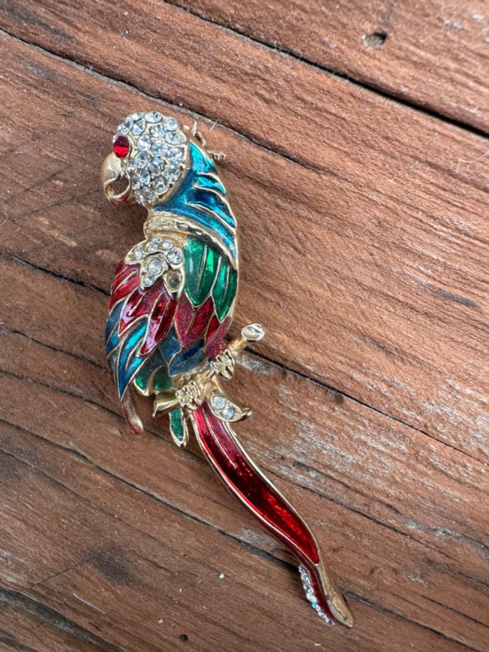 jolie broche doré oiseau perroquet émaillée bleu, vert et rouge et cristaux