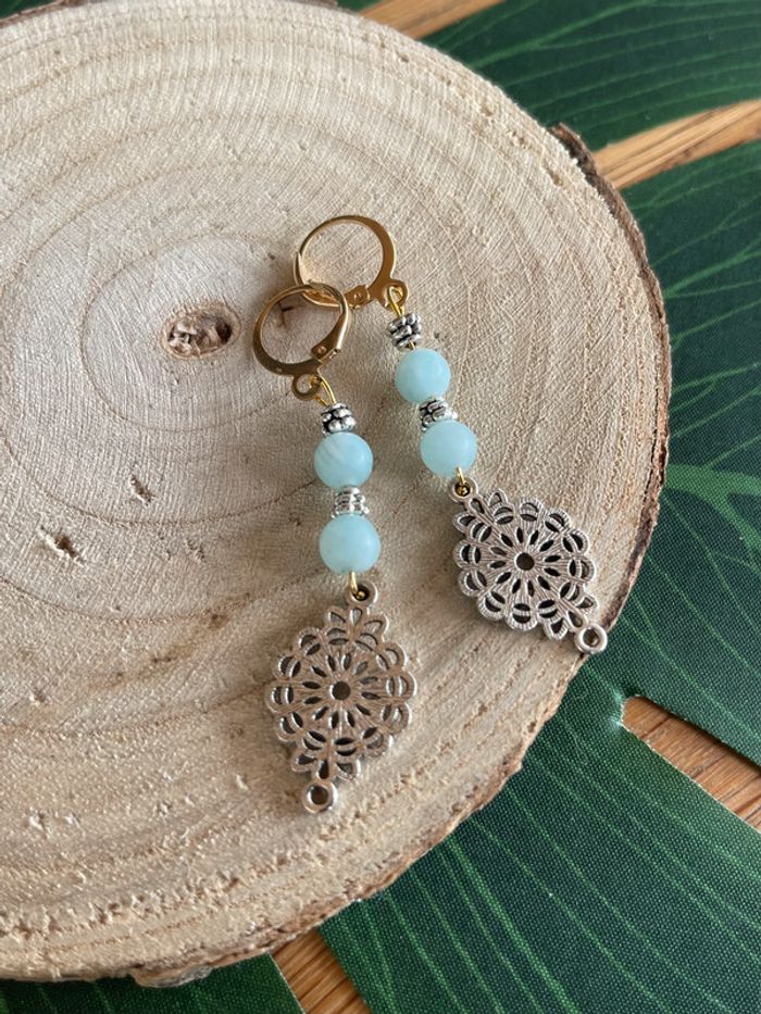 Boucles d’oreilles créoles dorées en pierres naturelles semi précieuses Aventurine verte givrée ornées d'un pendentif charme argenté. Modèle unique. Vertus et bienfaits de l’Aventurine • apporte amour et confiance en soi • réduit les ulcères et l’hypertension • apaise le stress • facilite la respiration • favorise l’endormissement • contribue à réduire les maux de tête • régénère la peau Hauteur 6 cm
