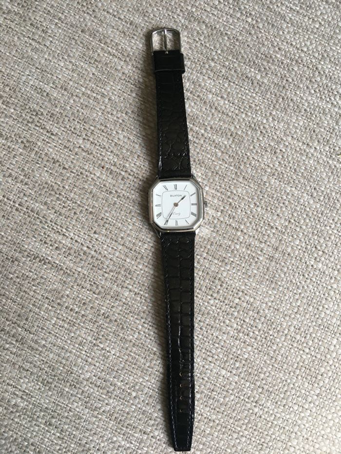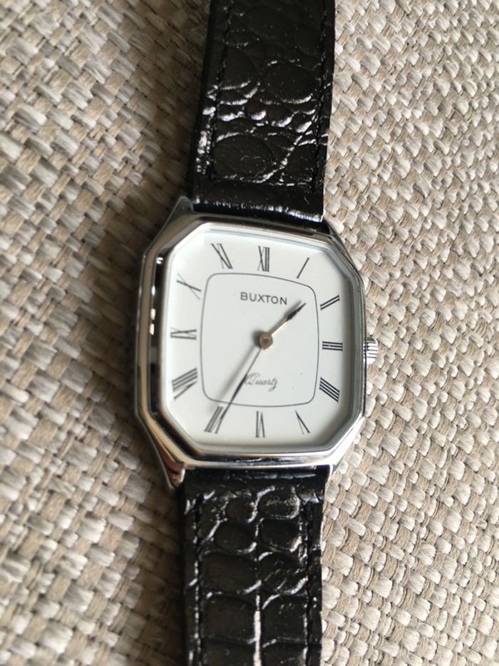 Montre vintage quartz Buxton, cadran acier inoxydable, verre en parfait état aucune rayure Bracelet réglable en cuir véritable verni effet peau de crocodile en très bon état juste quelques rayures sur le fond Pile à remplacer ne fonctionne pas