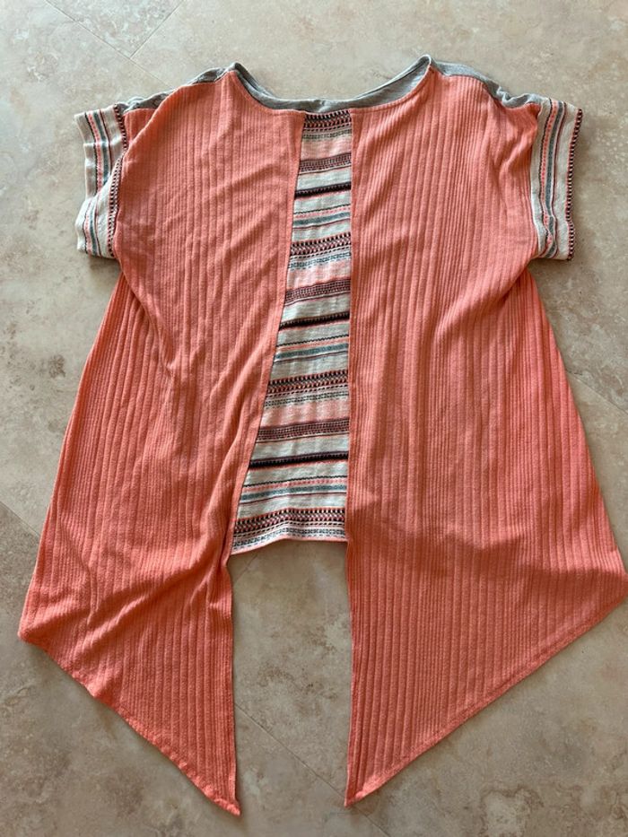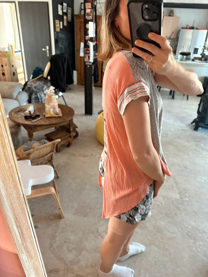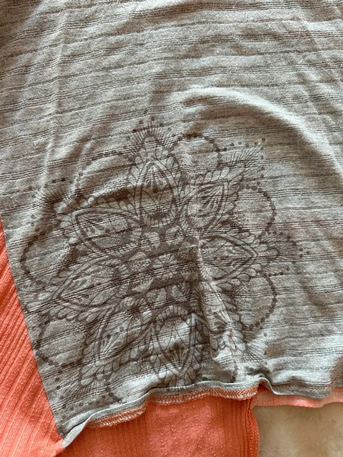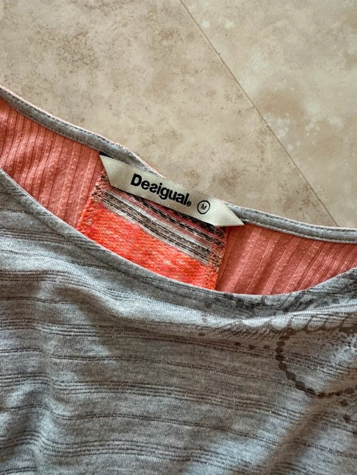 T-shirt asymétrique original Desigual Gris brodé de fil argenté et corail motifs fleurs pailleté brillant Dos en queue de pie