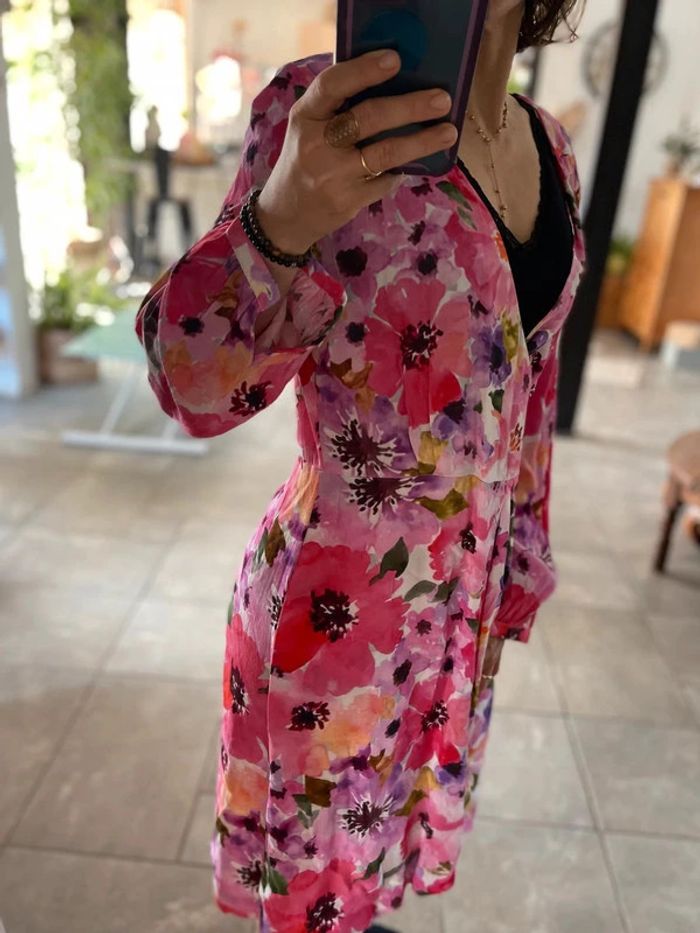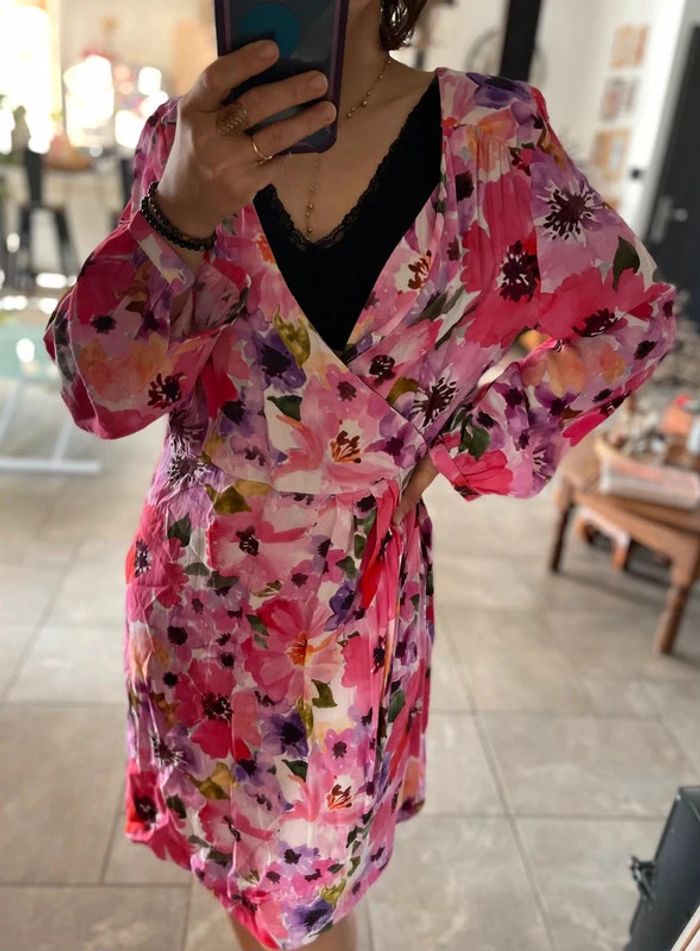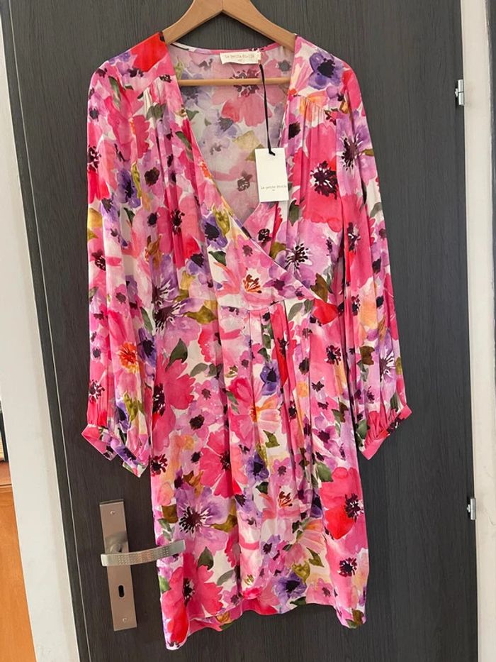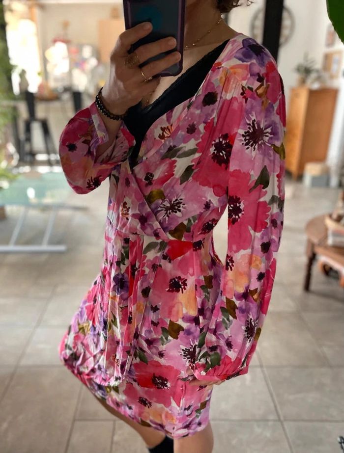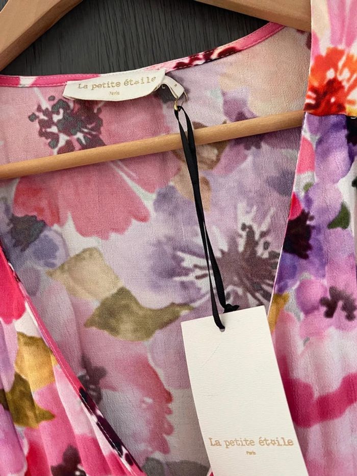 Superbe robe la petite étoile neuve motifs floraux, dans les tons de roses fuchsia et mauve manches longues bouffantes et longueur au dessus des genoux, centrée à la taille décolleté cache coeur très belle qualité prix boutique 85€