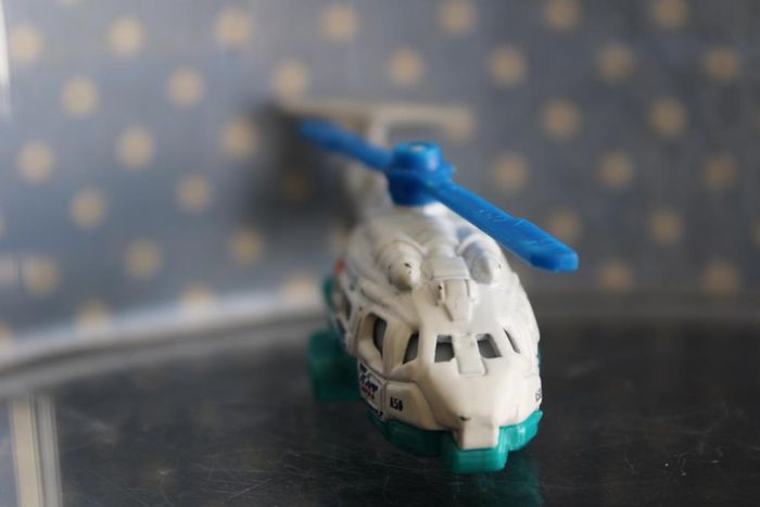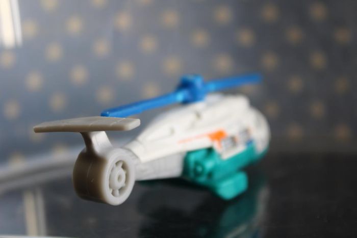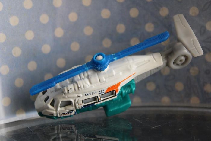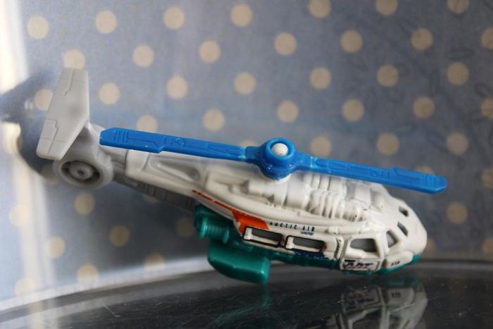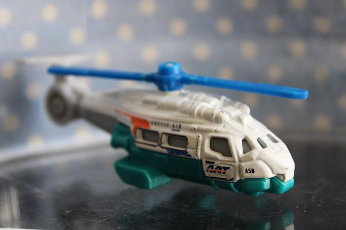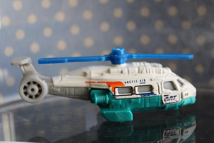 Hélicoptère miniature de sauvetage Échelle : environ 1:125 Couleur : Blanc Base : Plastique bleu turquoise Fabricant : Matchbox Année de production : 2018 sur un moule de 2015 Désigner : Mike Finizza En bon état. Rares manque de peinture. Traces de faiblesse sur l'hélice Réponds avec plaisir aux demandes d'informations complémentairre Réponse rapide envoi soigné dans les meilleurs délais