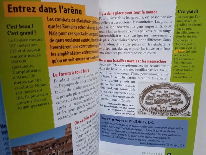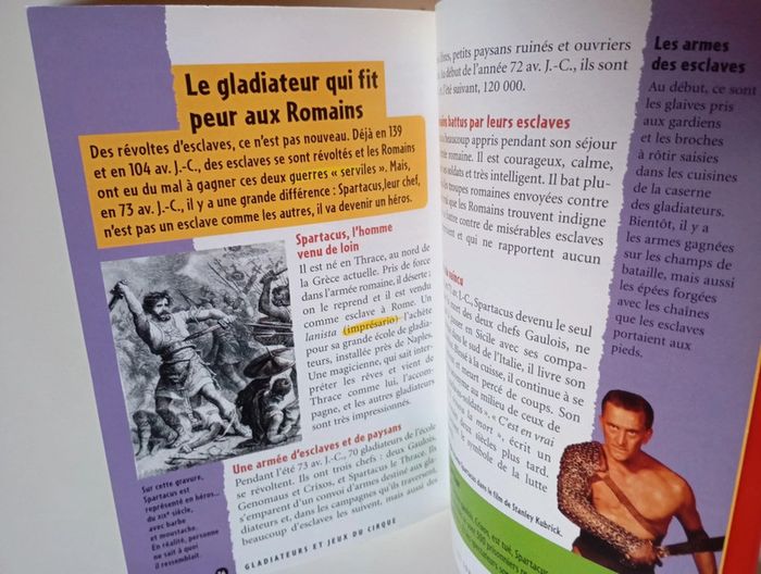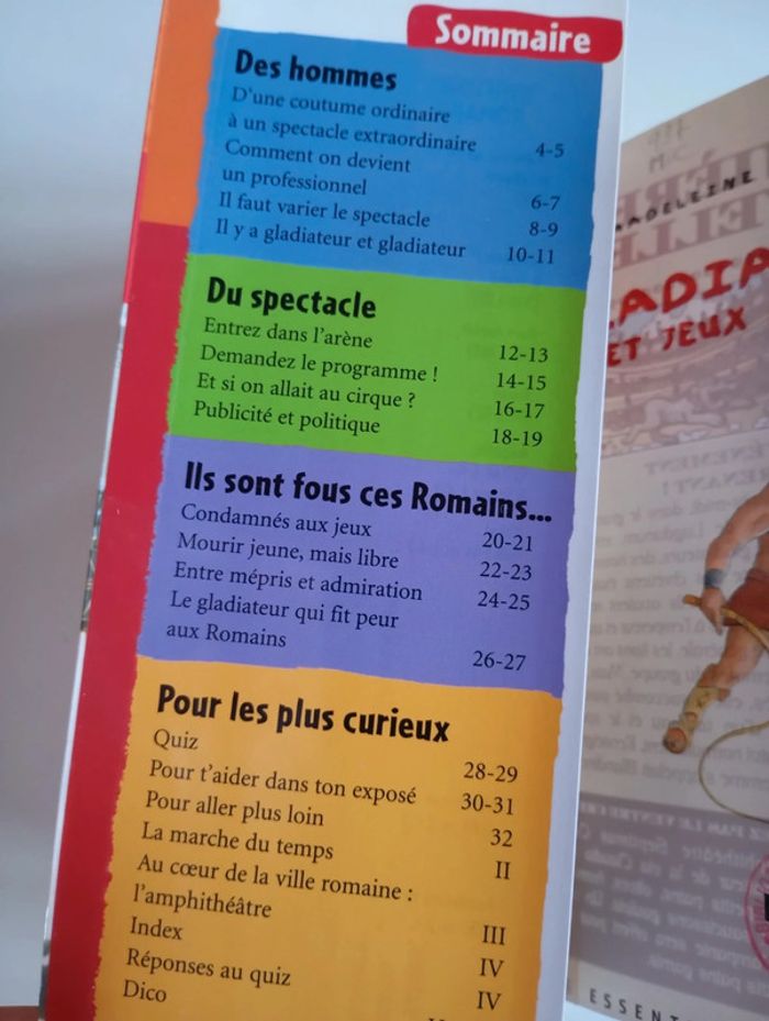 Gladiator, le film, tu connais ? Mais est-ce que tu sais qui étaient les vrais gladiateurs ? d'où ils venaient ? comment ils vivaient, et surtout mouraient ? Sais-tu que le cirque romain et l'amphithéâtre ne sont pas du tout la même chose ? En lisant cet Essentiel Junior, tu comprendras mieux ce qui se passait dans la tête d'un Romain assis sur les gradins, regardant les combats dans l'arène. Place au spectacle ! Commentaire : Voilà un superbe petit livre documentaire, rapide, concis et remarquablement illustré, qui entre vraiment dans le sujet et nous met dans l'ambiance des distractions romaines. On ne peut qu'apprécier que le sujet sois si bien traité, en si peu de pages. Petit guide indispensable à tous ceux qui sont intéressés par cette période de notre Histoire, et par les combats. Éditeur ‏ : ‎ Milan Poche ‏ : ‎ 32 pages Âge de lecture ‏ : ‎ 6 - 9 ans Dimensions ‏ : ‎ 12.1 x 0.4 x 17.9 cm Livre en très bon état (Livre de médiathèque, couvert, avec tampon) Je vends d'autres livres sur les gladiateurs #phil_peg_gladiateurs #antiquité #arènes #gladiateurs