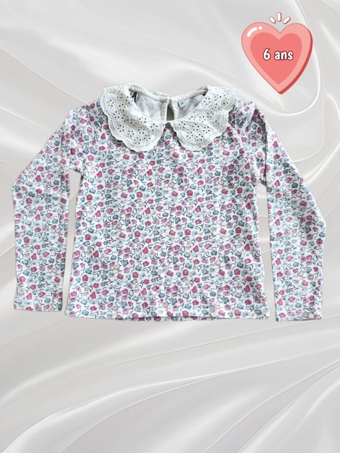Vends haut manches longues avec col, taille 6 ans, de marque inconnue, de couleur blanc avec motifs fleurs rouges et bleues 🌸, en coton et polyester. Remise en main propre possible ⚠️ Pas d'envoi par Vinted Go car aucun point dans ma région. #Nebchan_fille6ans