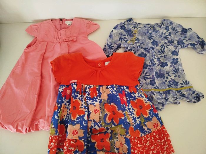 Adorables tenues pour bébé fille, taille 6 mois. Le lot comprend : 1 robe rose à manches courtes avec petit nœud 1 haut fleurie bleu/violet à manches longues, légère et fluide 1 haut à manches courtes orange vif avec jupe fleurie multicolore (marque Orchestra) Idéal pour le printemps/été. Très bon état, portées quelques fois seulement. Maison non-fumeur. #bébéfille #robe6mois #vêtementsbébé #okaidi #fleurs #étébébé #vintedkids