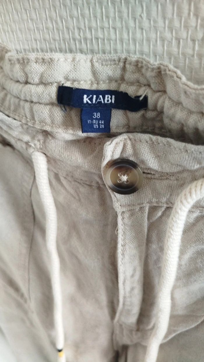 Pantalon léger et confortable de la marque KIABI, en taille 38 (équivalent US 28 / IT-RU 44). Coupe casual avec lien de serrage à la taille + bouton. Couleur beige clair . Deux grandes poches à l’avant, matière douce, idéale pour le printemps/été. En bon état général, quelques plis dus au rangement. N’hésite pas si tu veux plus d’infos !