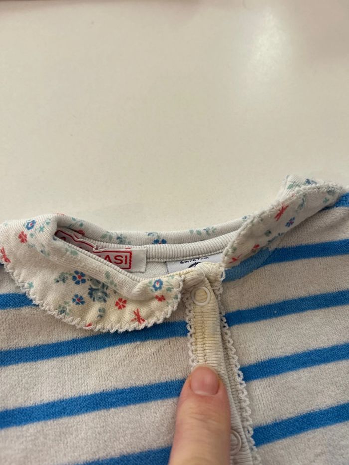Marinière bleu clair avec joli col fleuri Peu porté tissu encore tout doux mais Attention tache jaune au niveau du premier bouton pression (voir photo) N’hésitez pas à aller visiter mon dressing vêtement fille (0-6 ans) et garçon (0-3 ans), #liberty #petitbateau #jacadi #cyrillus #marlot #cyrillus Réduction appliquée sur les lots. Envoi rapide.