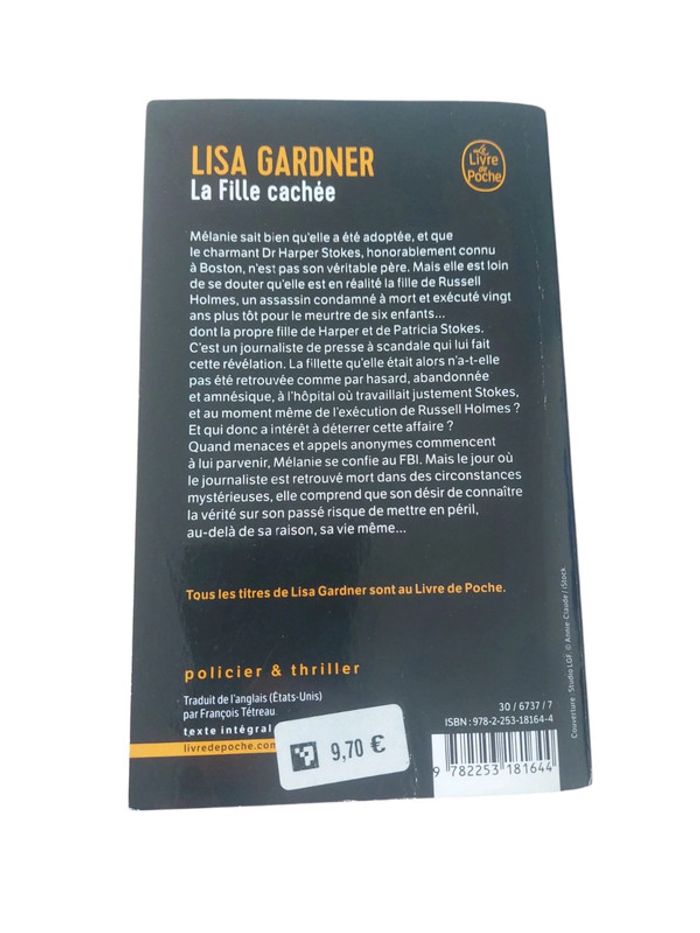 Livre la fille cachée de Lisa Gardner En très bon état Resumé: Mélanie sait bien qu'elle a été adoptée, et que le charmant Dr Harper Stokes, honorablement connu à Boston, n'est pas son véritable père. Mals elle est loin de se douter qu'elle est en réalité la fille de Russell Holmes, un assassin condamné à mort et exécuté vingtans plus tôt pour le meurtre de six enfants..dont la propre fille de Harper et de Patricia Stokes.C'est un journaliste de presse à scandale qui lui fait cette révélation. La fillette qu'elle était alors n'a-t-elle pas été retrouvée comme par hasard, abandonnée et amnésique, à l'hôpital où travaillait justement Stokes, et au moment même de l'exécution de Russell Holmes? Et qui donc a intérêt à déterrer cette affaire ? Quand menaces et appels anonymes commencent à lui parvenir, Mélanie se confie au FBI. Mais le jour où le journaliste est retrouvé mort dans des circonstances mystérieuses, elle comprend que son désir de connaître la vérité sur son passé risque de mettre en péril,au-delà de sa raison, sa vie même..