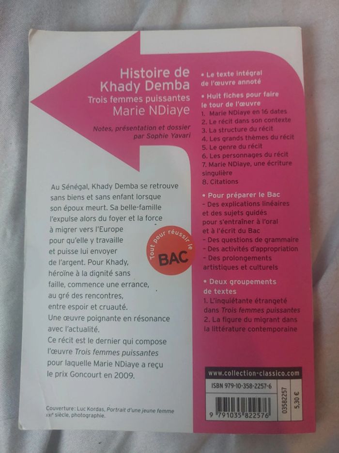 Livre histoire de Khady Demba 3 femmes puissantes De Marie NDiaye En très bon état Résume: Au Sénégal, Khady Demba se retrouve sans biens et sans enfant lorsque son époux meurt. Sa belle-famille l'expulse alors du foyer et la force à migrer vers I'Europe.Tout pour qu'elle y travaille et puisse lui envoyer de l'argent. Pour Khady,héroïne à la dignité sans faille, commence une errance,au gré des rencontres,entre espoir et cruauté.Une œuvre poignante en résonance avec l'actualité.Ce récit est le dernier qui compose I'œuvre.Trois femmes puissantes pour laquelle Marie NDiaye a reçu le prix Goncourt en 2009.
