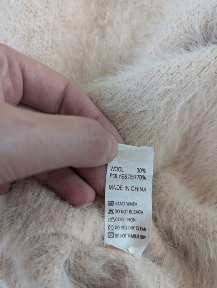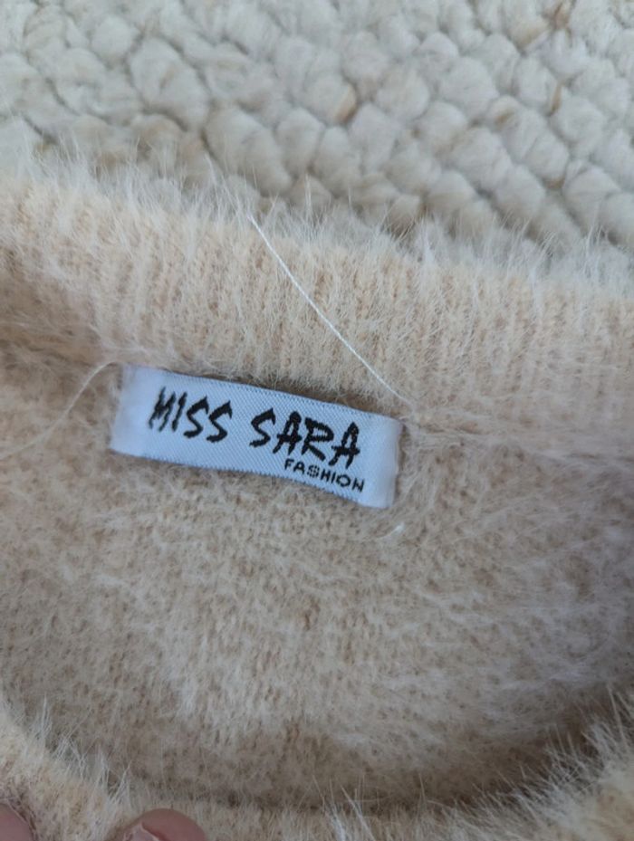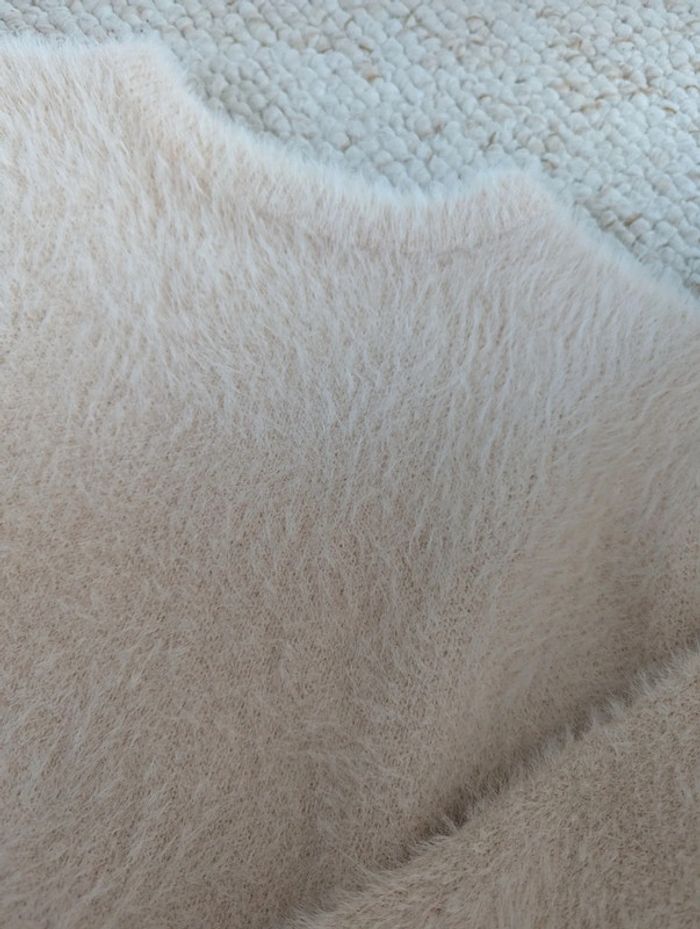Pull laine (30%). Extrêmement doux, style laine angora. Couleur pêche / saumon, très délicate. Lavée mais jamais portée. Taille unique.
