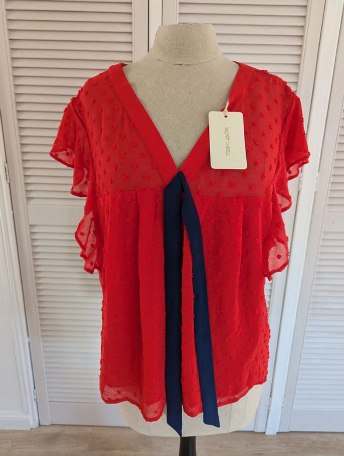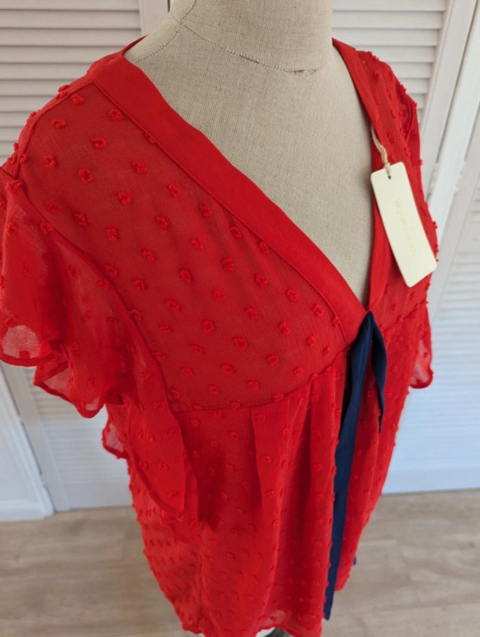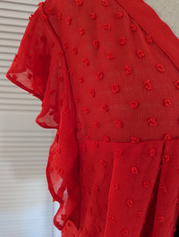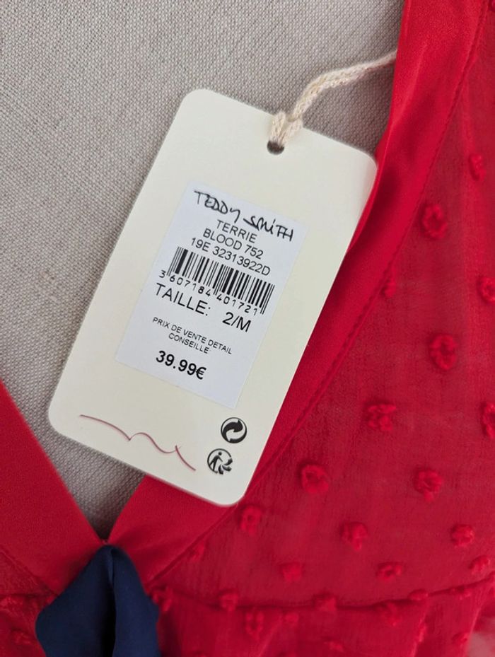 Top rouge Neuve. Tissu léger avec volants et Plumetis. Marque Teddy Smith. Neuf avec étiquette : valeur 39,99€ Disponible en M ou L sur demande.