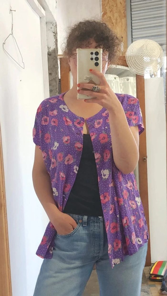 Jolie chemisette taille 36 à petit 42 En soie légère lilas et rose, motif a fleurs