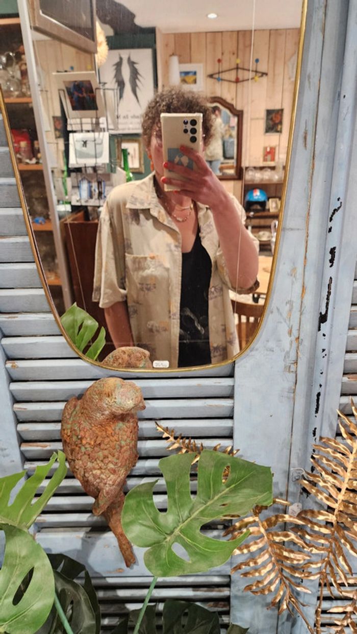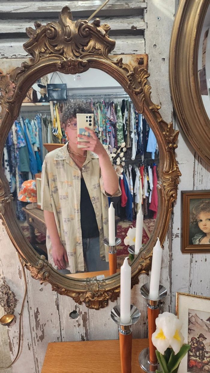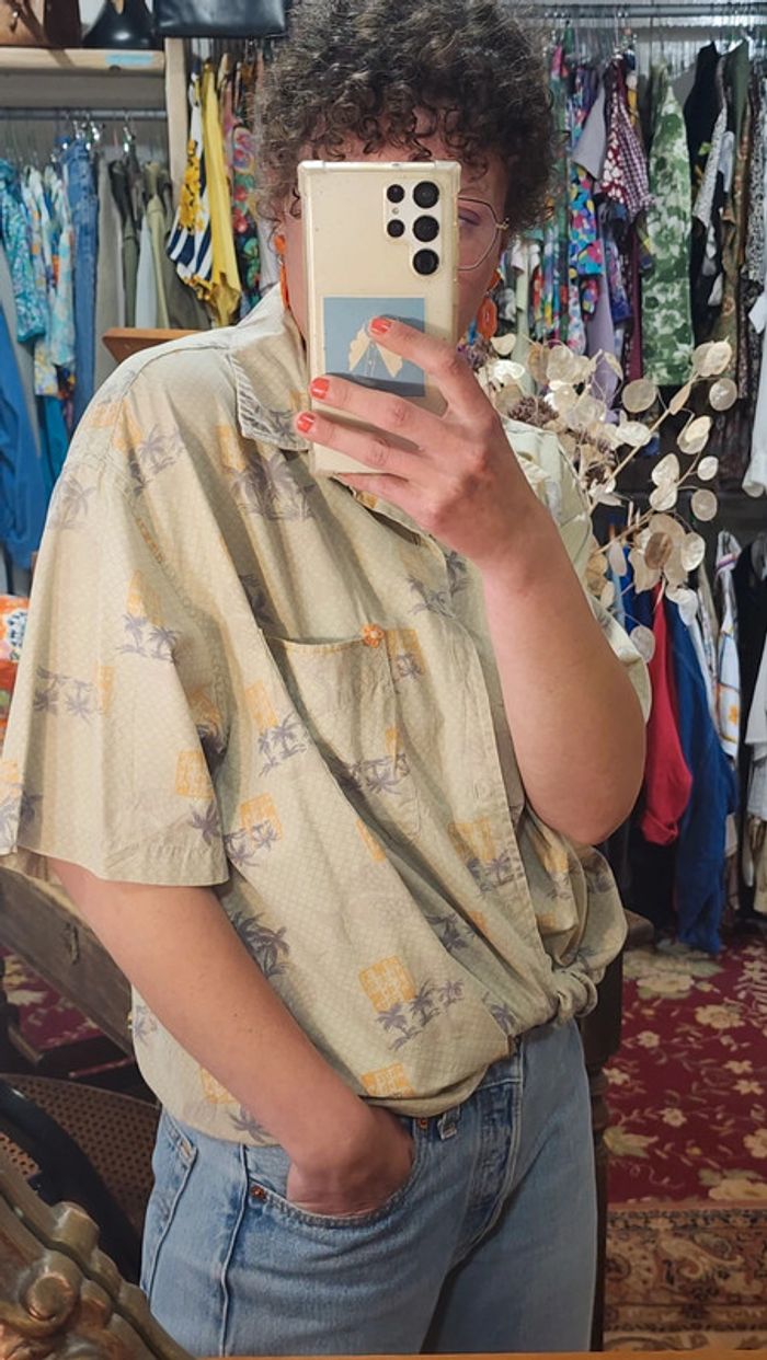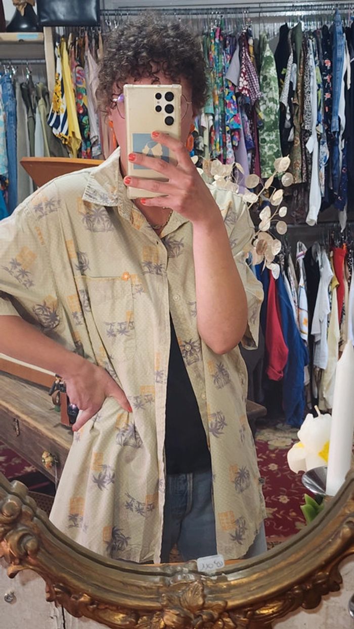 🌼 Remise sur les lots 🌼 -5% pour 2 articles -10% pour 3 articles -15% pour 4 articles -20% pour 5 articles et + www.instagram.com/kozhaevintage 🫶 Chemise mixte en coton Motif d'été palmiers Taille L homme Jusque petit 42 femme