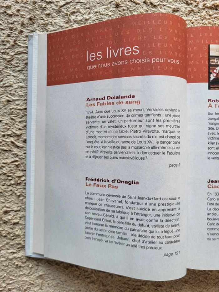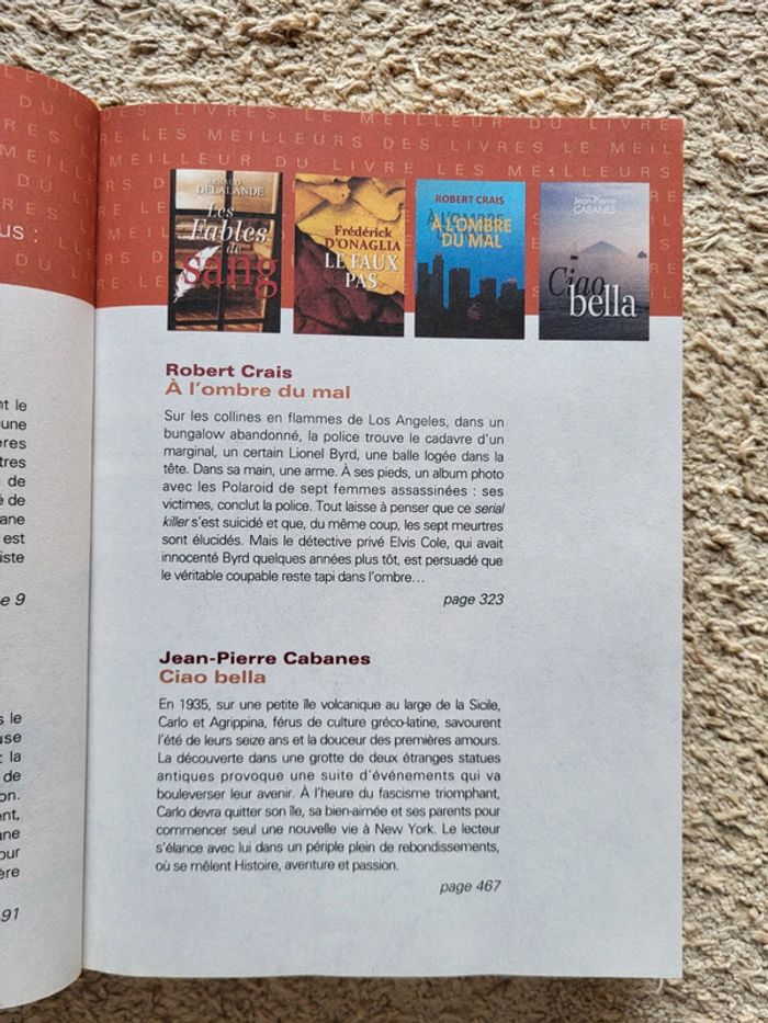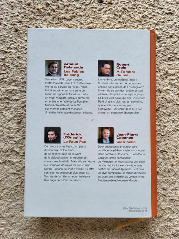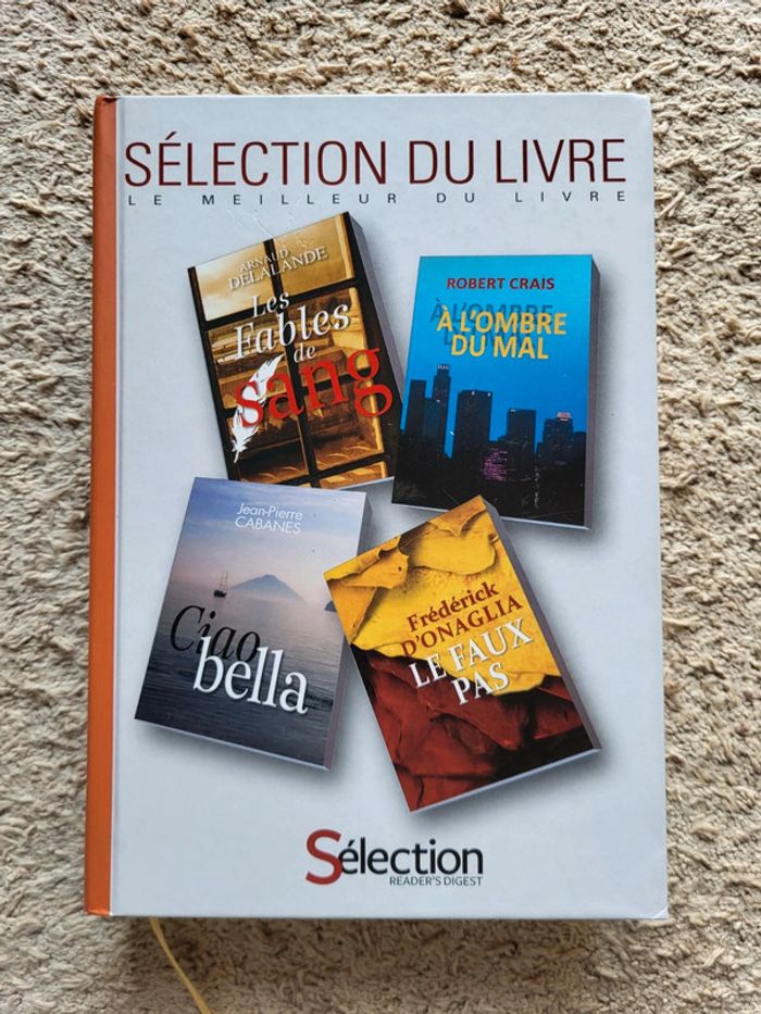 . Livres contenant 4 romans : . Les fables de sang d'Arnaud Delalande . À l'ombre du mal de Robert Crais . Le faux pas de Frédérick d'Onaglia . Ciao bella de Jean-Pierre Cabanes . Couverture cartonnée, 590 pages en très bon état . Le meilleur du livre du Sélection Reader's Digest ⭐️ N'hésitez pas à visiter mon dressing : réductions sur les lots sont activées ✨️ Destin