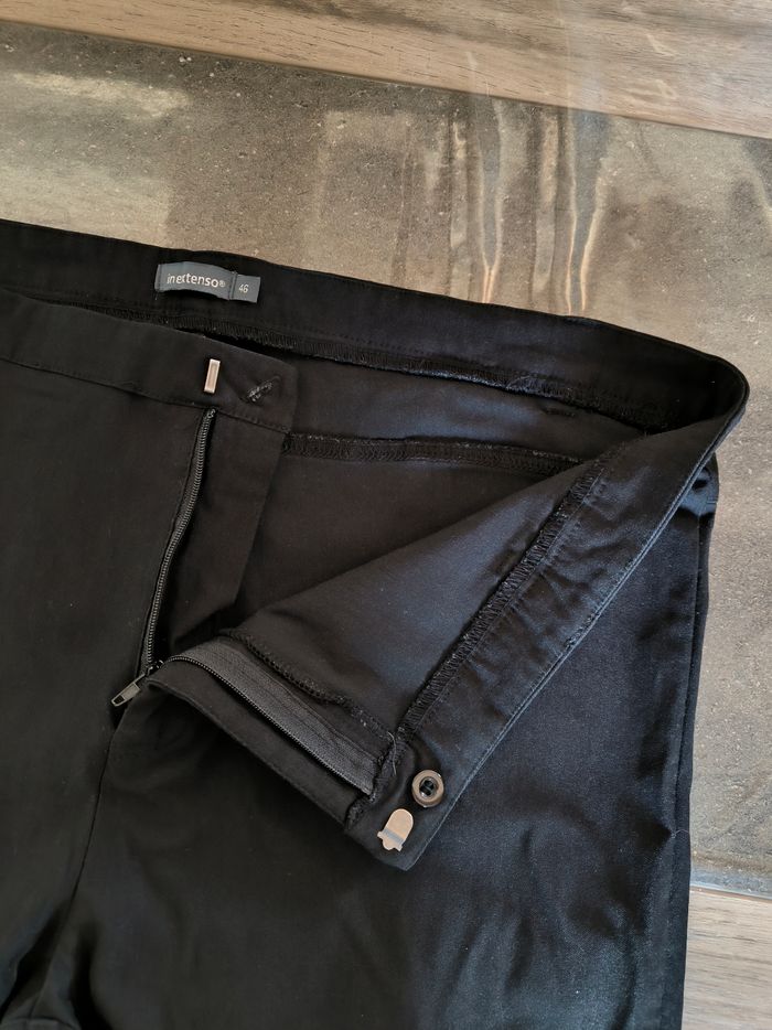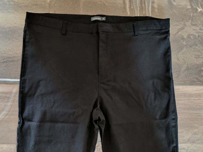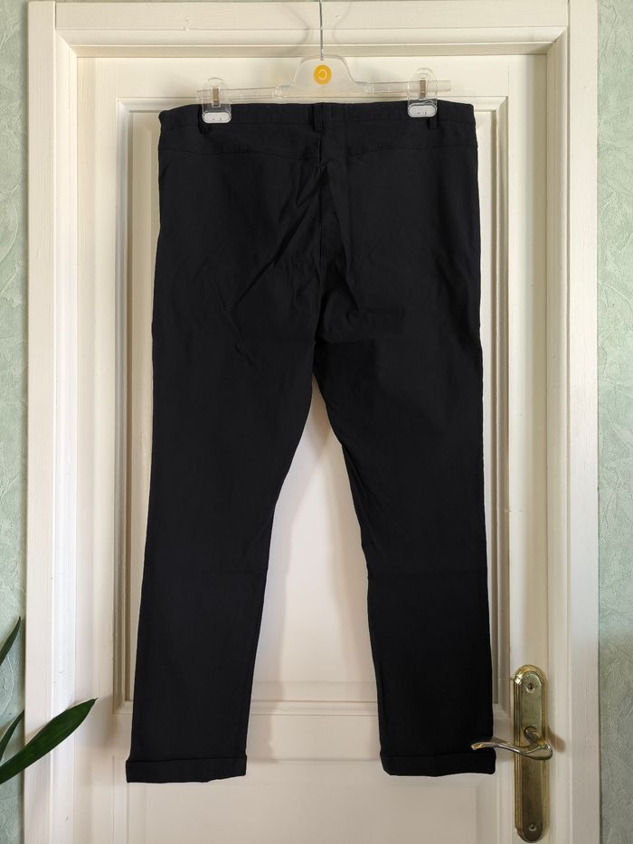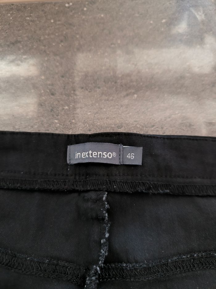 Pantalon jegging Marque In Extenso Taille 46 • Coloris noir • Fermeture par fermeture éclair et crochet • Revers bas des jambes • Tissu fin, stretch Largeur taille non étirée : 44 cm Largeur taille étirée au maximum : 60 cm Longueur totale : 93 cm Longueur entrejambe : 67 cm Largeur bas des jambes : 16 cm Peu porté, en très bon état #evelyne_taille_46