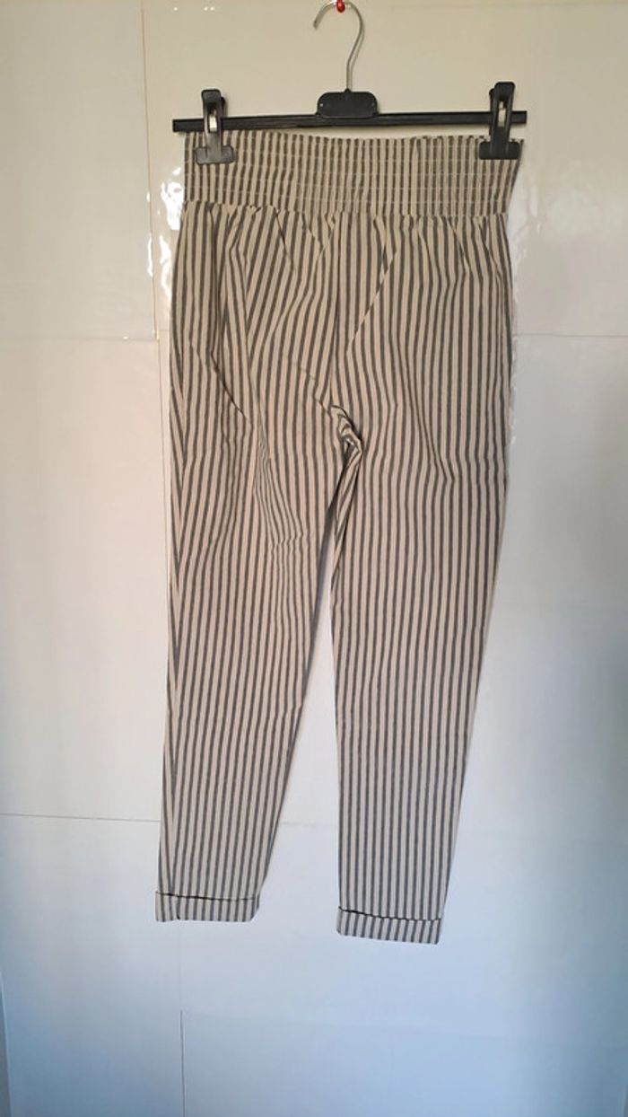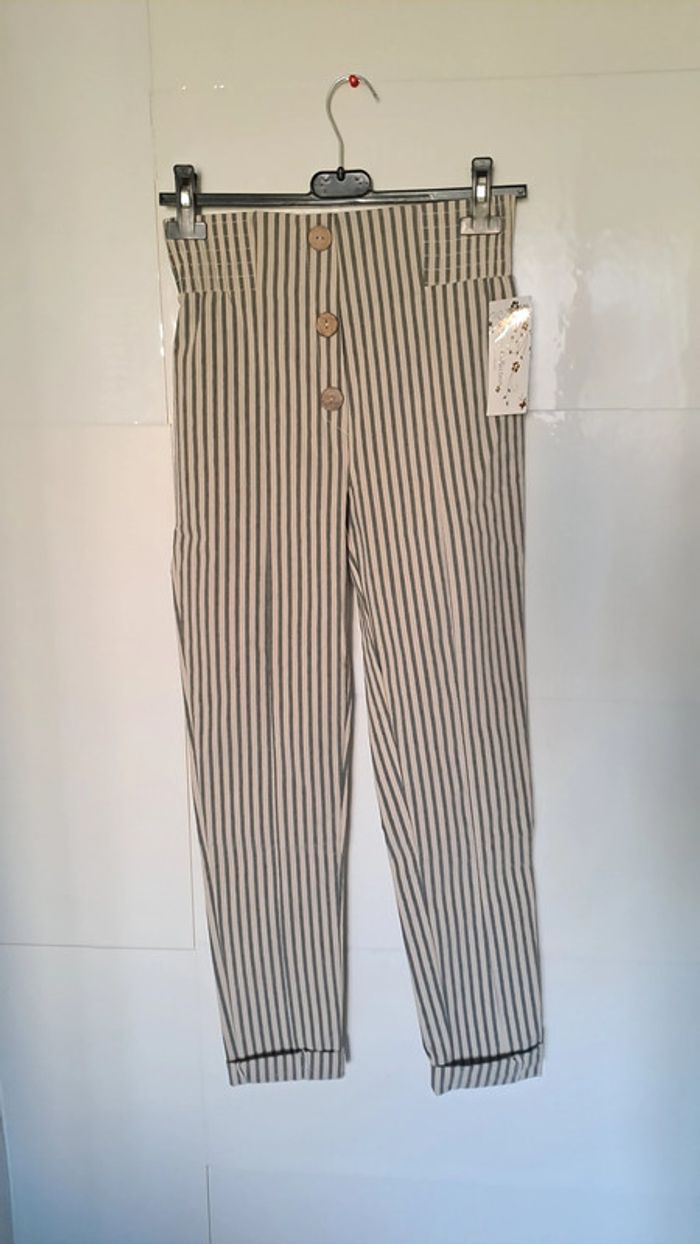 🦚Pantalon léger, taille haute, beige rayer blanc. Taille unique. En très bon état avec étiquette. 🧵60% coton,35% polyester, 5% elastane 📏Largeur taille: 33cm 📏Largeur hanche:42cm 📏Longeur:95cm 🦚Dressing trier par # dans mon " à propos". #gavelotsTUfemme