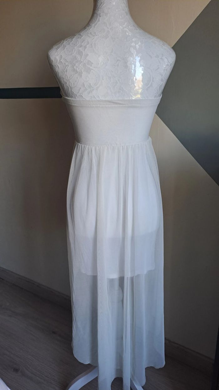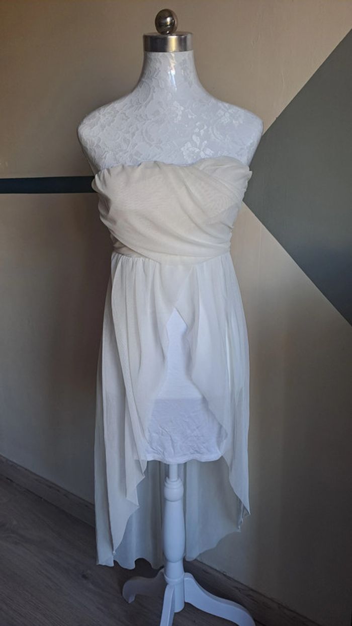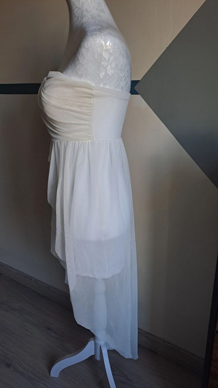 🦚Jolie robe bustier de couleur blanche et crème.En très bon état. Portée 1 fois pour un baptême, matière très agréable,robe qui ne descend pas malgré le bustier. 🧵 95% Polyester, 5% Elastane. 📏Largeur=30cm 📏Longueur de la robe=60cm 📏Longueur avec Le tulles =107cm 🦚Dressing trier par catégories et par taille dans mon à propos. #gavelotsTUfemme