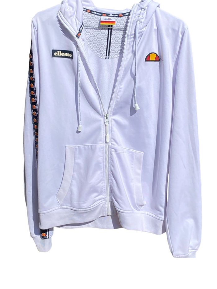 Veste zippée Ellesse Taille XS Proche du neuf, juste la peinture de l’attache de la fermeture un peu enlevée . La couleur en réalité est bien blanche😉
