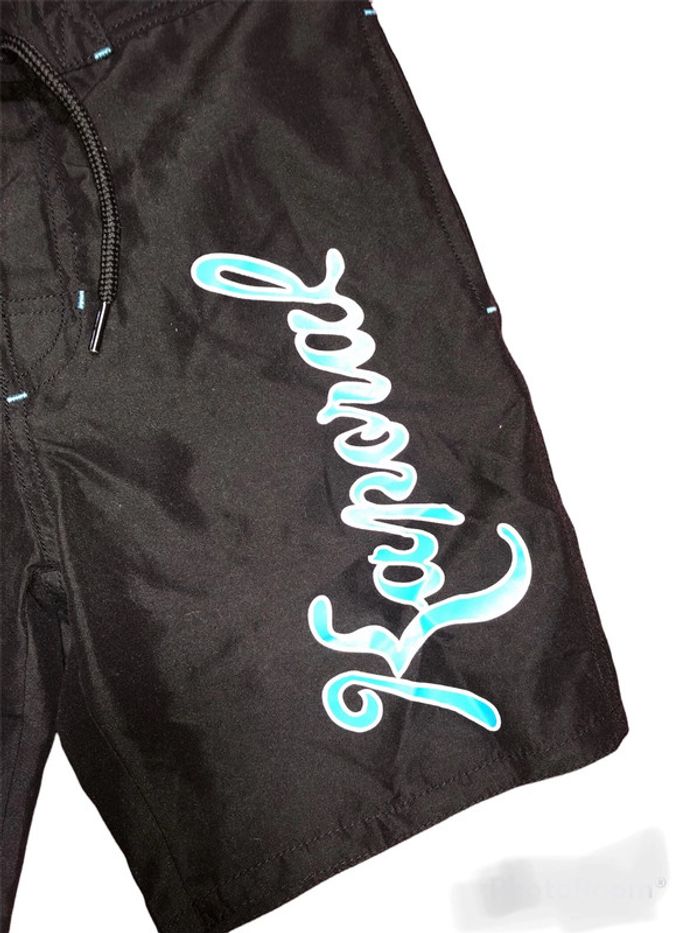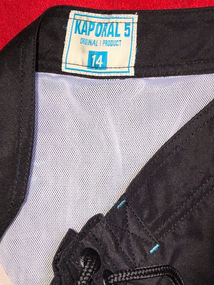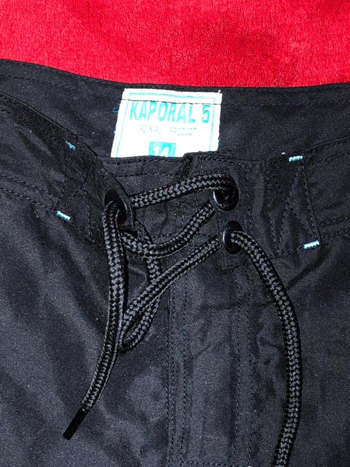 Bermuda de bains Kaporal marqué 14ans, amis équivaut à un 12 ans. Noir, écriture turquoise Très bon état, bien noir.😉 un autre différent en vente, mais de même taille.