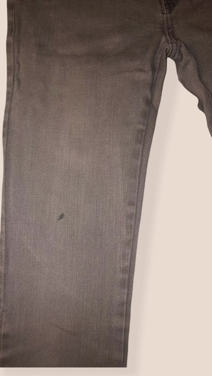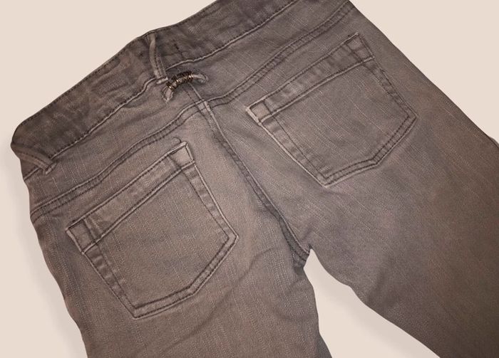 Jean gris (couleur correspondant à la première photo) taille 11/12 ans bien que peu porté, une tache sur la cuisine voir photo.