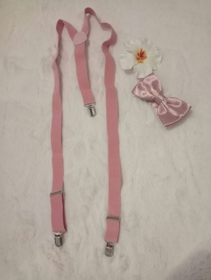Ensemble bretelles et noeud papillon rose réglables, le noeud est satiné.