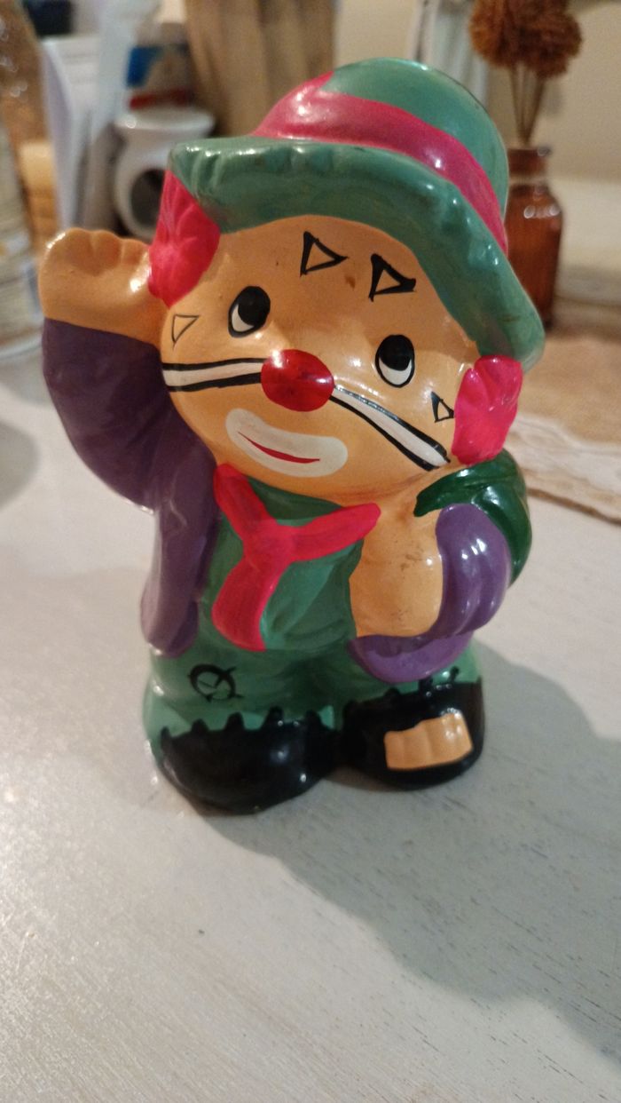 Tirelire vintage clown fait parti d'une collection de 3 clowns, très bon état, manque le capuchon.