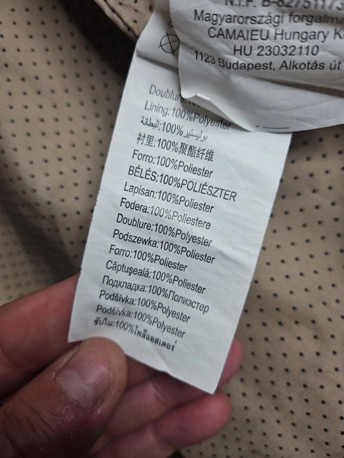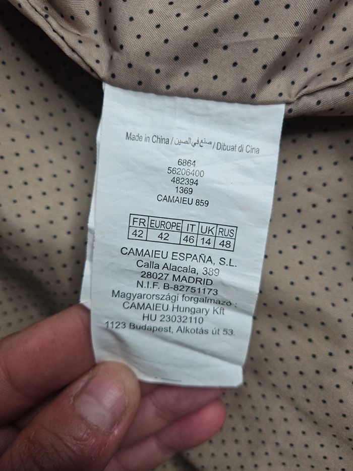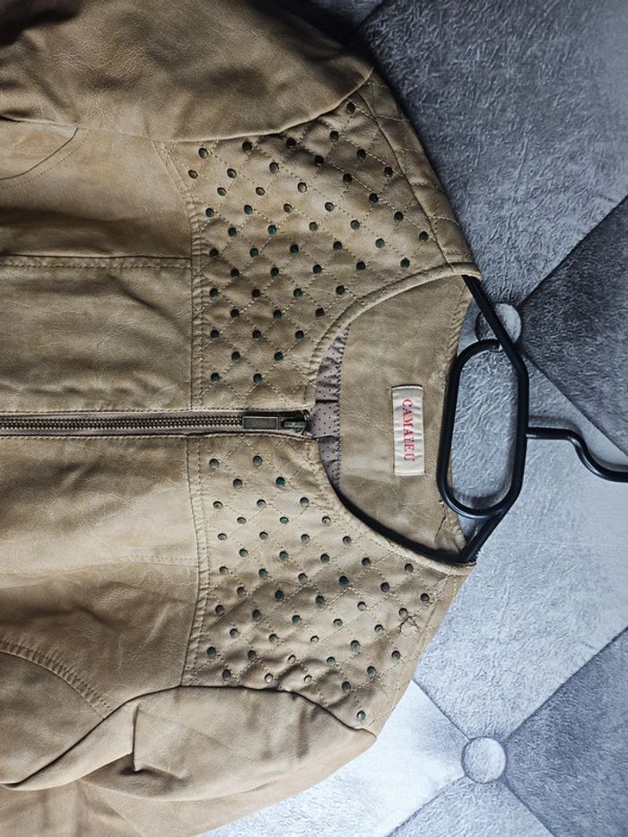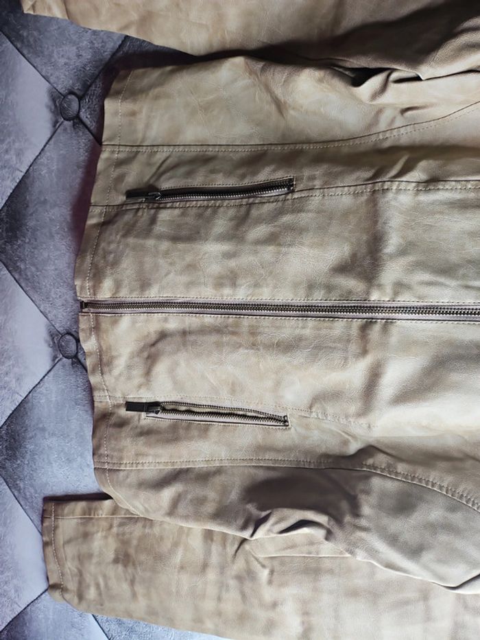 Jolie veste effet cuir en polyester Marque camaïeu taille 42 En bon etat ... le colis commence à se abîmer au niveau de la nuque d ou le prix très bas