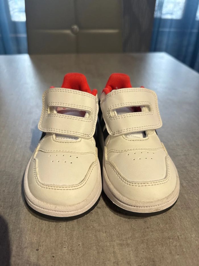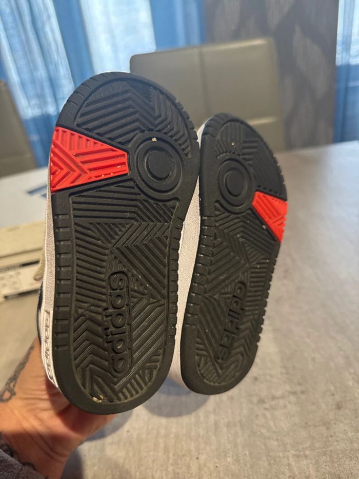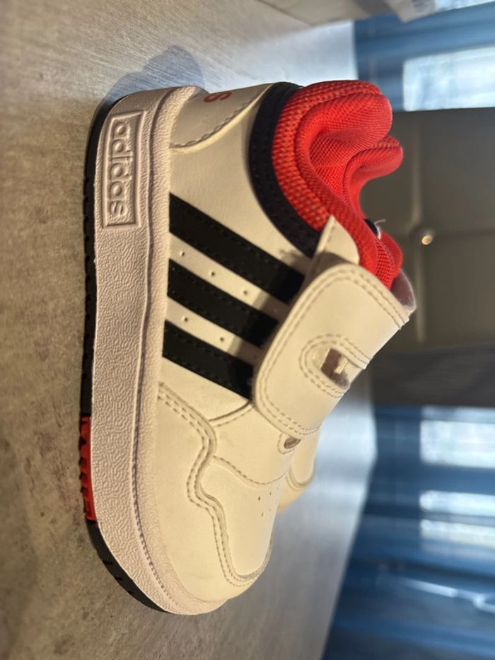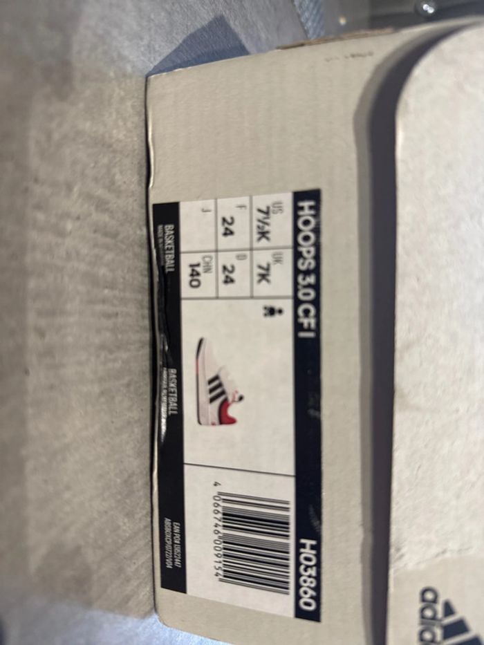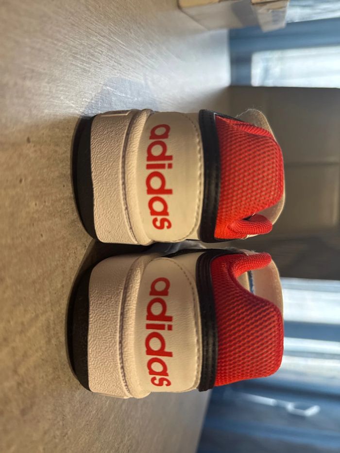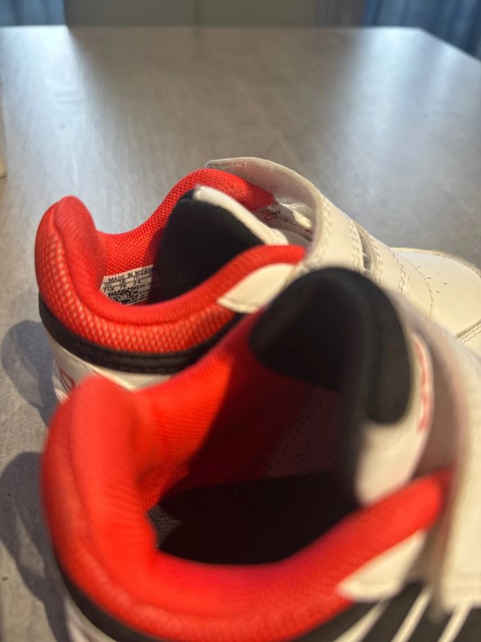 Baskette Adidas garçon mise 1 fois en très bon état couleur blanc rouge noir avec boîte d origine pointure 24