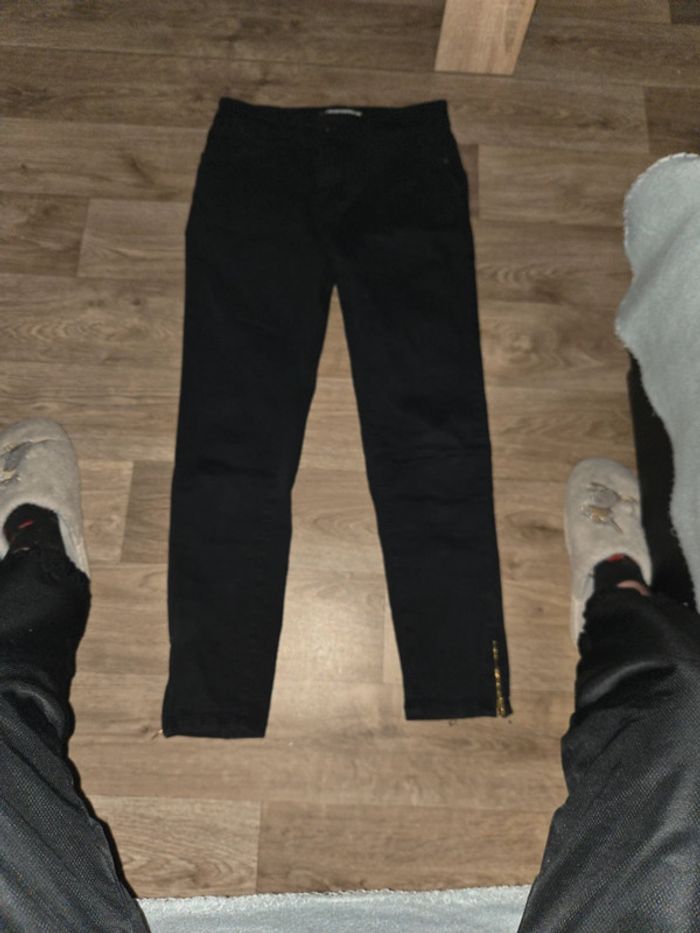 Taille 36 noire avec petite fermeture au niveau du bas du pantalon