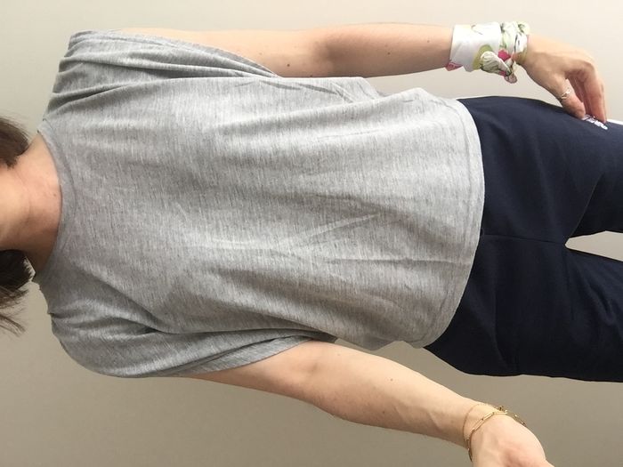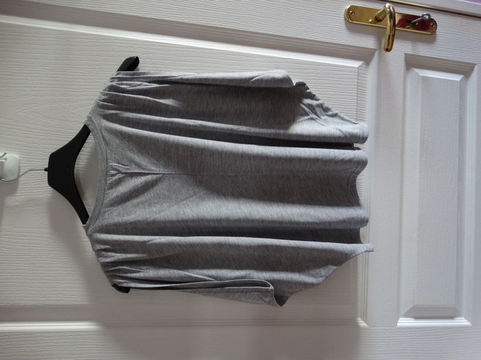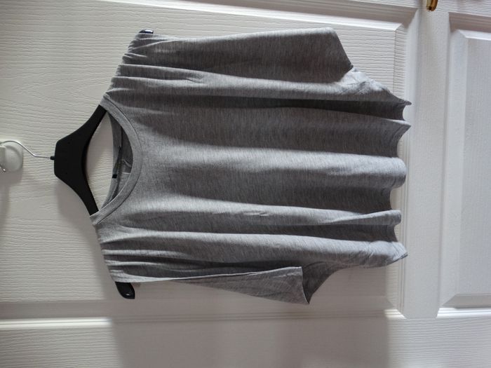 T-shirt gris uni, manches larges chauve-souris, taille S.