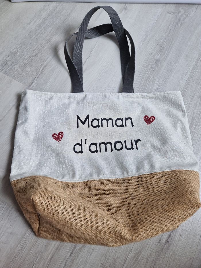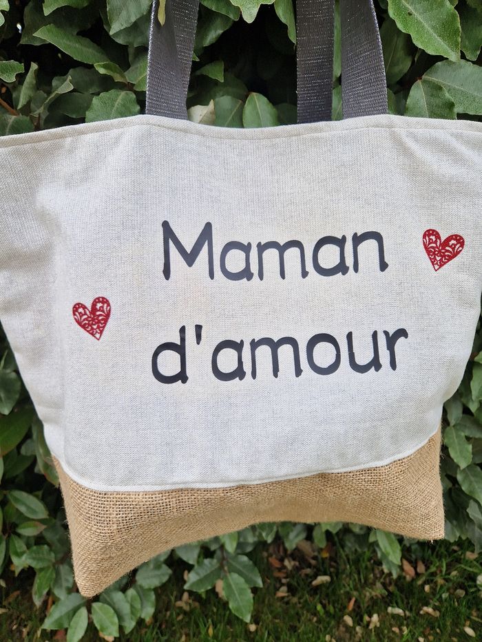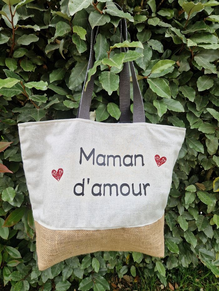 🚨Dernier Disponible 🌸Sac Cabas Fête des Mères 🍀Haut en tissus , bas en toile de jute 🍀Flocage Maman d'amour 🍀30° en machine 🍀Fait Main TARIF NON NÉGOCIABLE