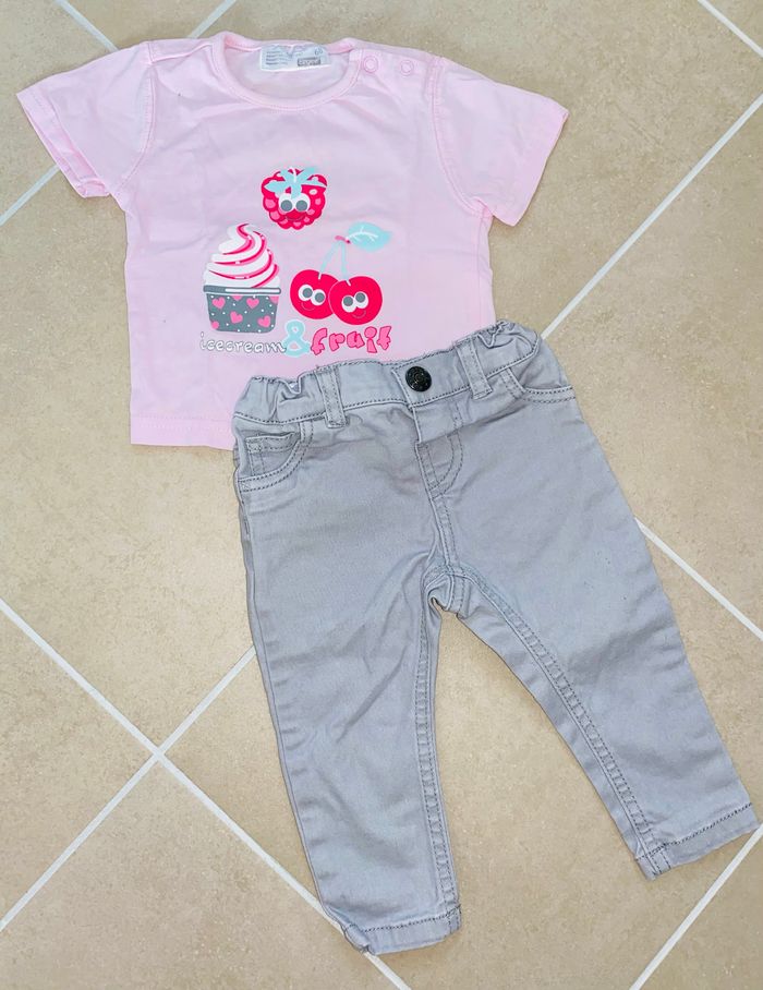 T-shirt et jean 6 mois /68cm T-shirt rose pâle avec motifs glace et fruits et jean gris réglable à la ta Parfait état