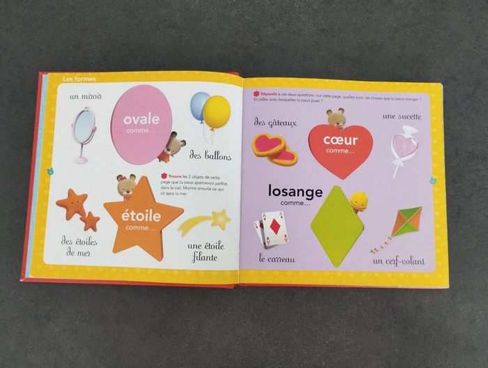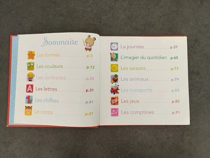 Imagier Plein de thèmes abordés Chiffres, lettres, formes, couleurs, corps, saisons, animaux, transport...