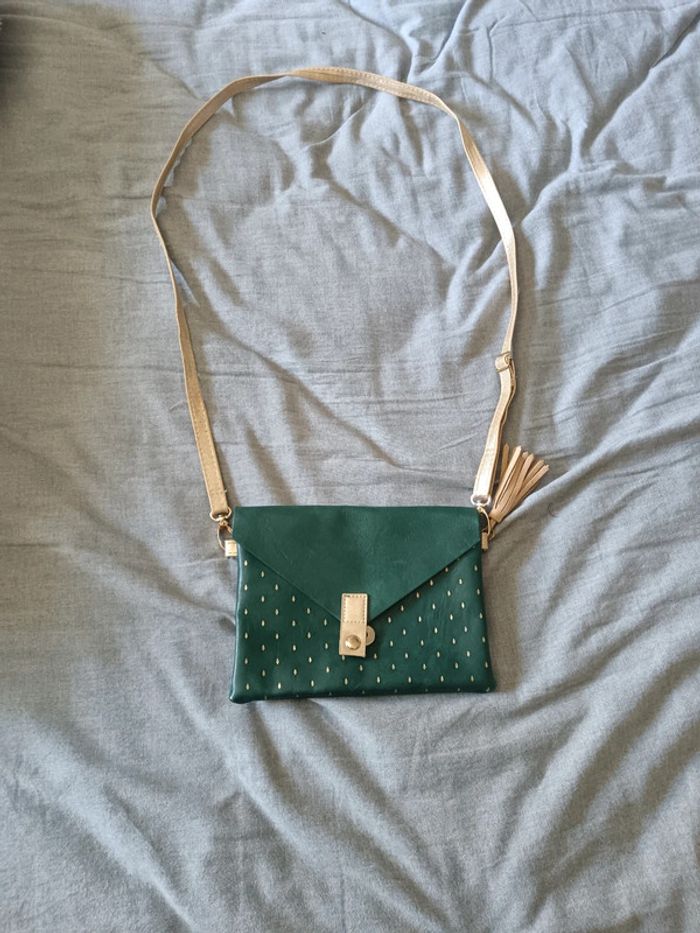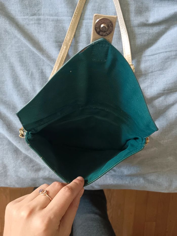 Couleur vert foncé et doré Bandoulière réglable et se détache 1 seul compartiment principal et une petite poche zippée derrière