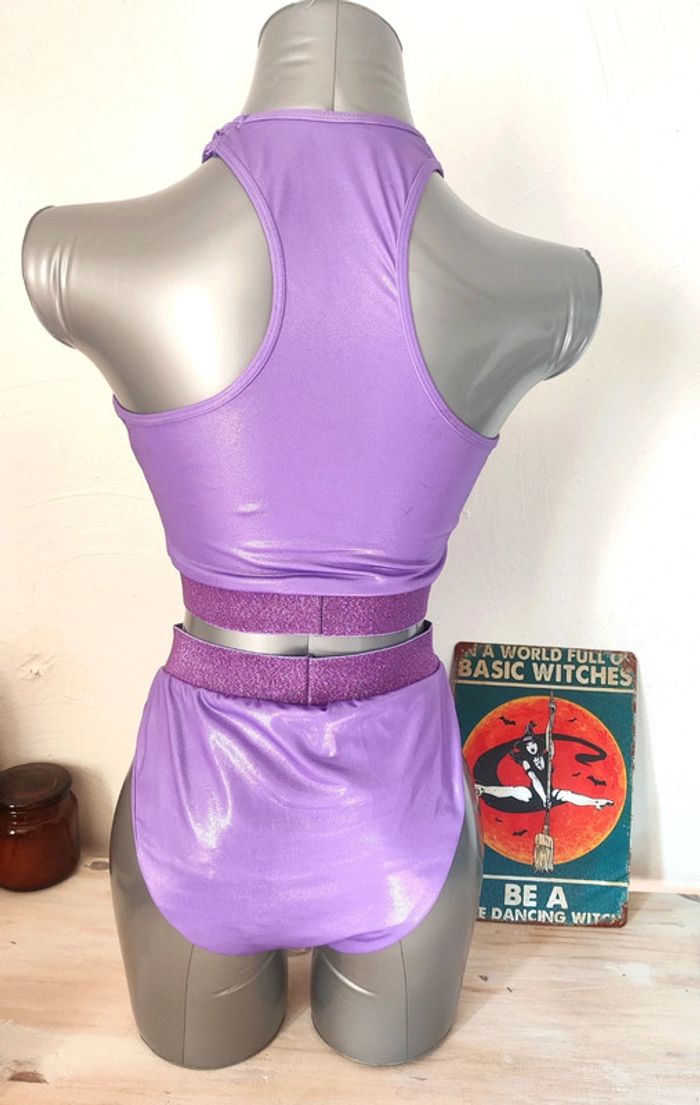 Ensemble de pole dance violet scintillant Fermeture de l'encolure par crochet ( peu visible une fois mis) Fait main sur la base de l'upcycling Taille M #poledance #poledanceoutfit #poledanceclothes #polewear
