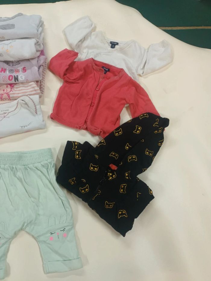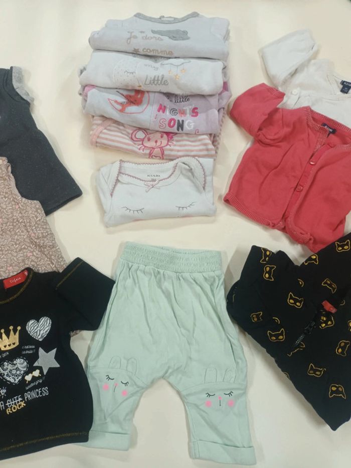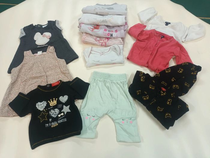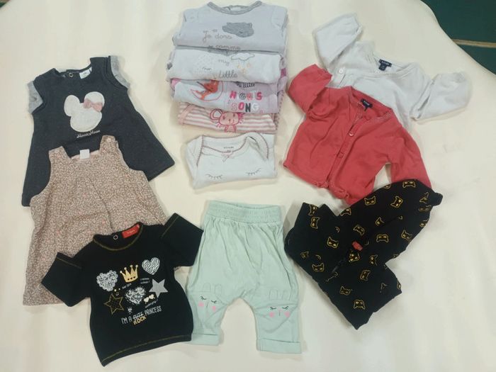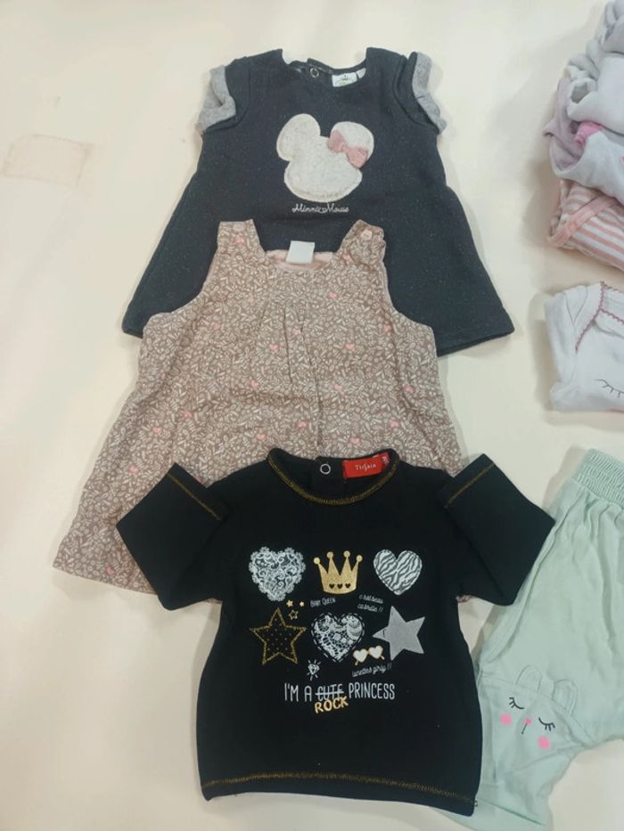 Lot de vêtements fille 3 mois : - 4 pyjamas velours - 1 body manches longues - 2 robes (1 minnie pailleté) - 1 tee shirt - 2 gilets dont 1 attache cache coeur - 1 gilet zippé - 1 legging Petit defaut : arriere body : tache en transparence Pyjama : un des pyjama a un peu de velour (tres tres légèrement) enlevé #tiitedrey_hiver_fille_3m
