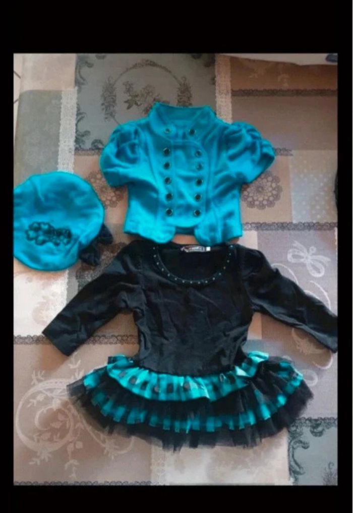 ✨️jolie tenue complète ✨️robe manches longues + bolero + bonnet ✨️ bleue clair et noir ✨️partie jupe, effet froufrou ✨️6 mois Jamais porté #tiitedrey_hiver_fille_6m