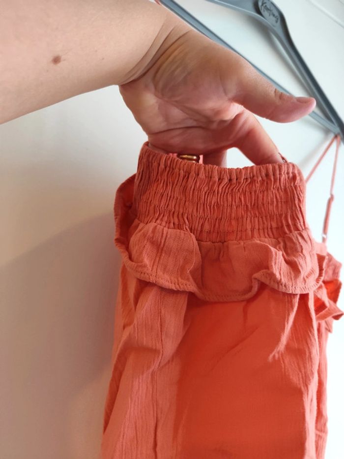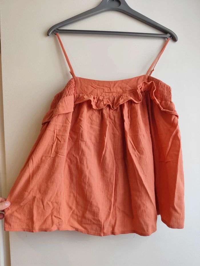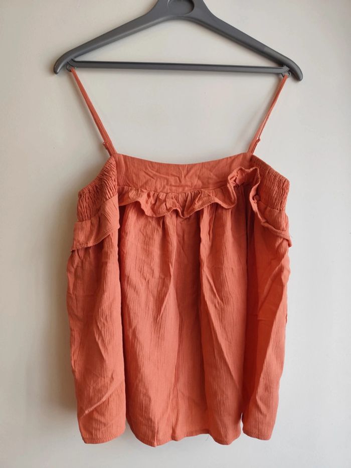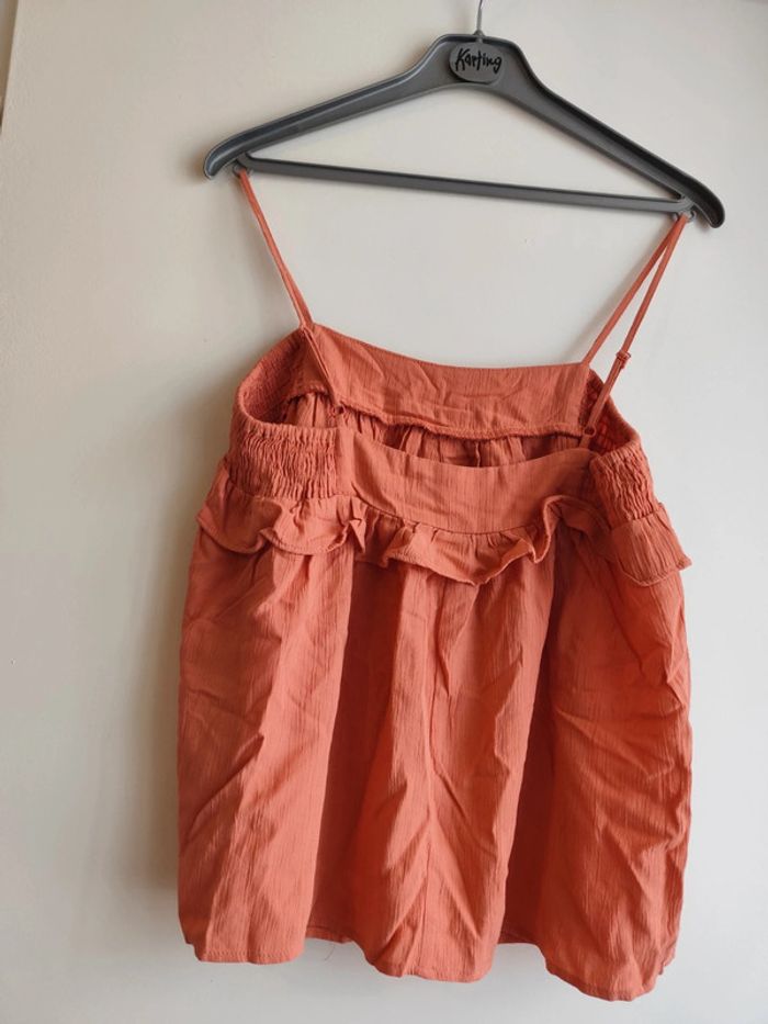 #femme38samcec1802 Débardeur fluide à frou frou couleur vieux rose/saumon. Fines bretelles Taille 38 Neuf jamais porté Promod