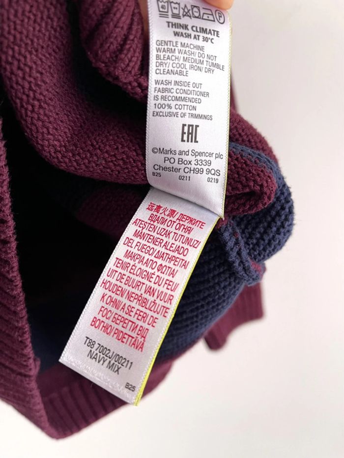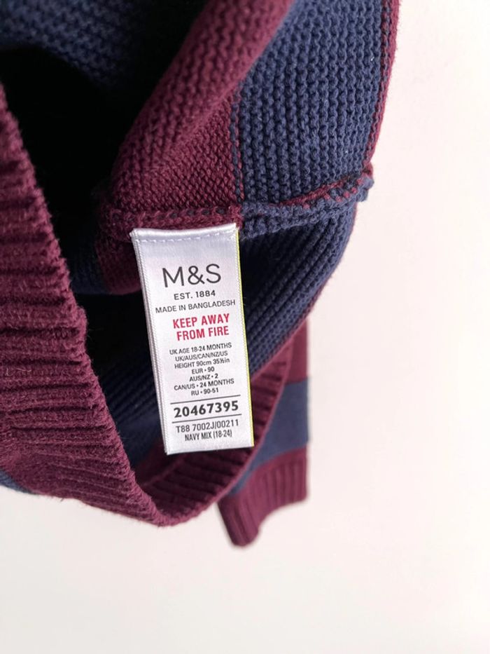 Pull enfant taille 18-24 mois preppy Marks & Spencer à grosses rayures bleu marine et rouge bordeaux Très bon état bien que porté. Peut être juste un léger délavage par rapport à quand il était neuf, mais il rend encore très bien ! Son grand avantage étant qu’il ne bouloche quasiment pas ! Maille 100% coton La “vraie” couleur est celle des zooms avec les étiquettes. Largeur d’aisselle à aisselle: 33cm Longueur manche (mesure prise à partir de la couture de l’aisselle): 25cm Longueur manche (mesure prise à partir de la couture de l’épaule): 33cm Largeur base (élastiquée): 30cm Longueur totale (mesure prise de dos): 37cm