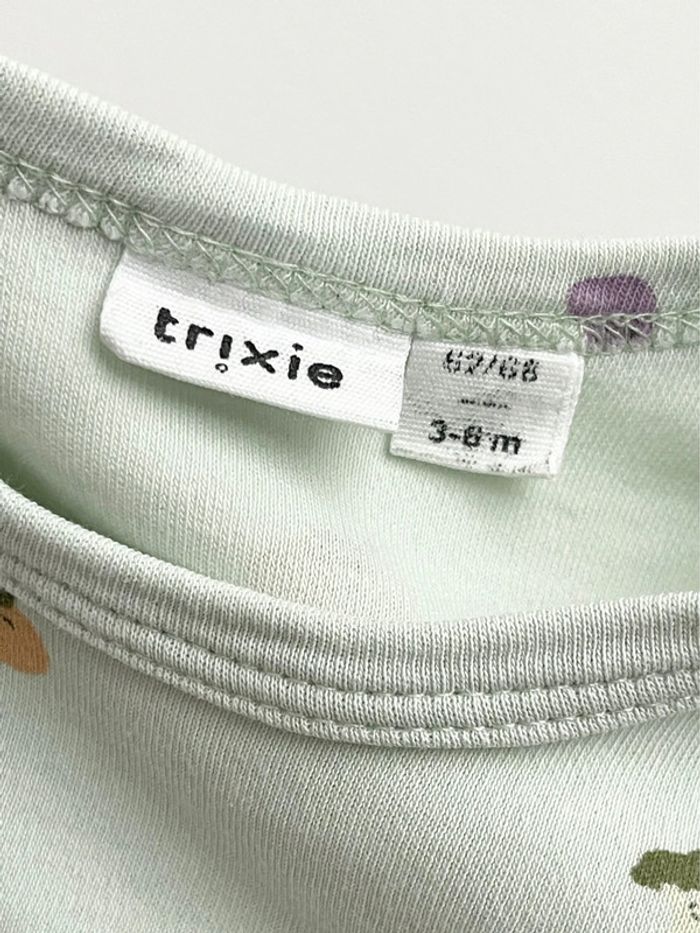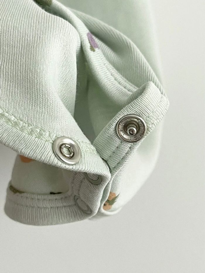 Adorable body manches courtes mixte de la marque Trixie en 100% coton bio motif petits légumes 🥦 Couleur vert tendre / pistache, mixte, conviendra aussi bien à un petit garçon qu’à une petite fille 👶 Très bon état, rien à signaler ! Taille 3-6 mois, mais taille plus petit que d’autres marques je trouve ! Essayez-le dès 3 mois voir même avant en fonction de la taille de bébé 😊 Fermé par boutons pression à l’entrejambe. Tissu et finitions de qualité. Prix neuf 15,99 euros