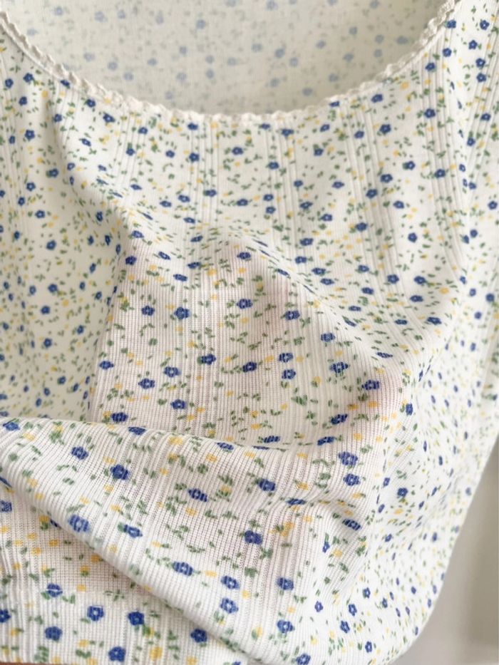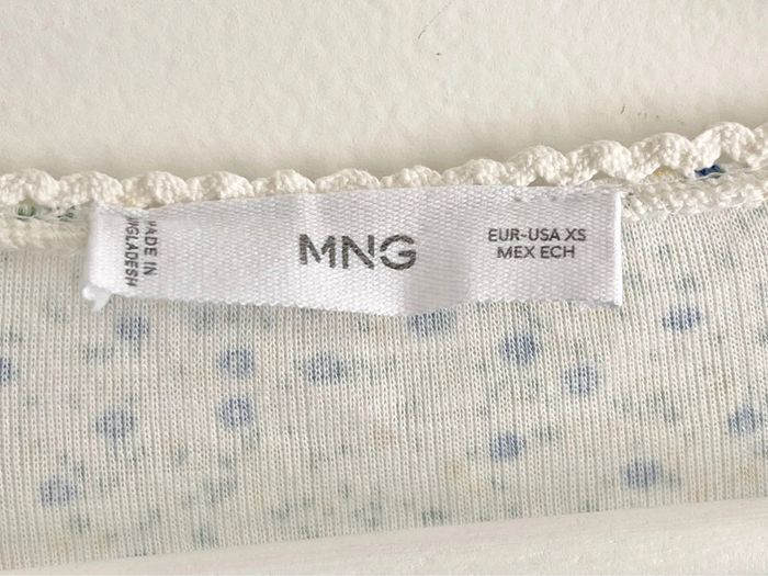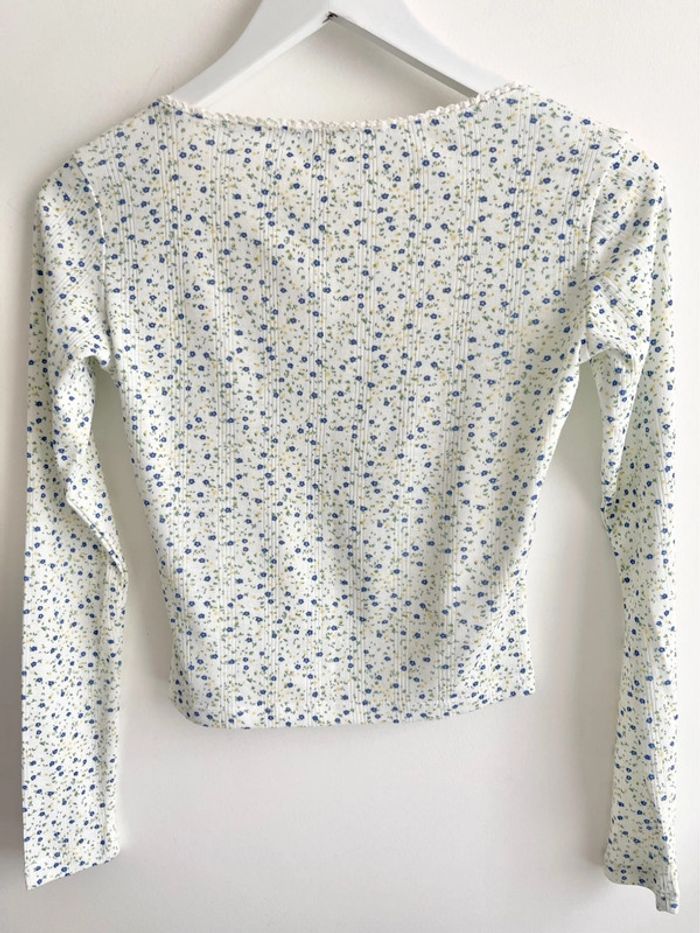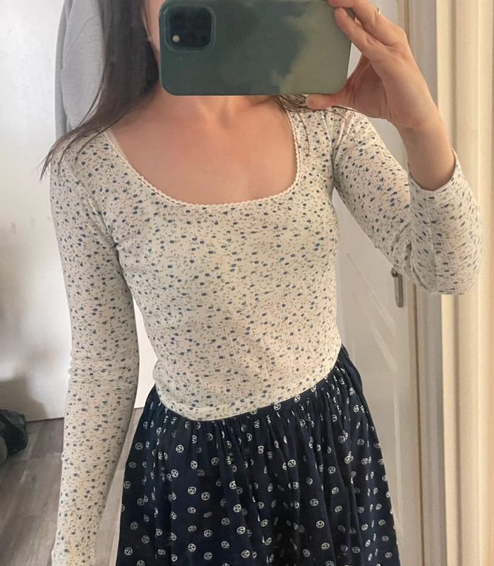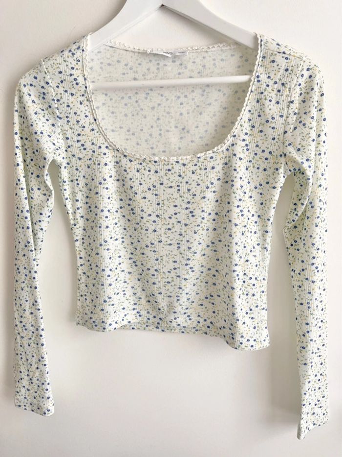 Crop top / haut court à manches longues mango MNG taille XS Fleuri, petites fleurs bleues et jaunes sur fond blanc Comme neuf Col forme carrée bien dégagé, avec dentelle sur tout le pourtour Très mignon et romantique ! Idéal avec un jean taille haute ou une salopette/robe salopette Tissu partiellement côtelé, un peu stretch Dimensions mesurées à plat: Largeur d’aisselle à aisselle: 41cm Largeur base: 38,5cm Largeur d'épaule à épaule (mesure prise à partir des coutures des manches): 38cm Longueur manche (mesure prise à partir de la couture de l’aisselle): 49cm Longueur manche (mesure prise à partir de la couture de l’épaule): 59cm Longueur totale (mesure prise de dos): 44cm