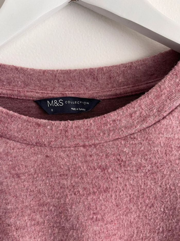 Sweat Marks & Spencer couleur vieux rose chiné avec inscription rouge “très bien” en français Taille 8 uk, convient pour un XS-S (en fonction de si vous le voulez plus ou moins ajusté) Super mignon porté ! Mis une ou deux fois, de très légères bouloches peuvent être visibles si vous l’inspectez de très près mais ça ne se voit pas dans la couleur chinée. Tout doux !