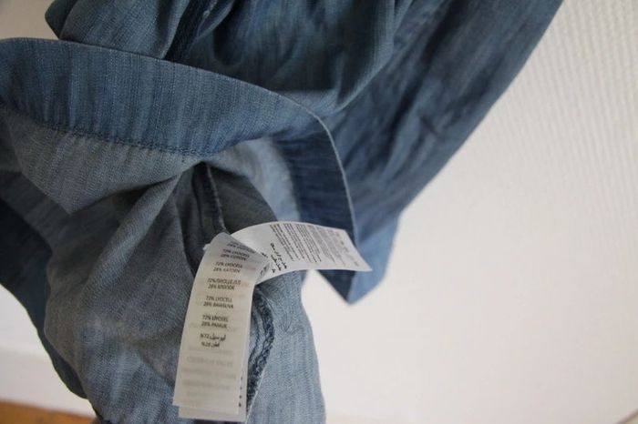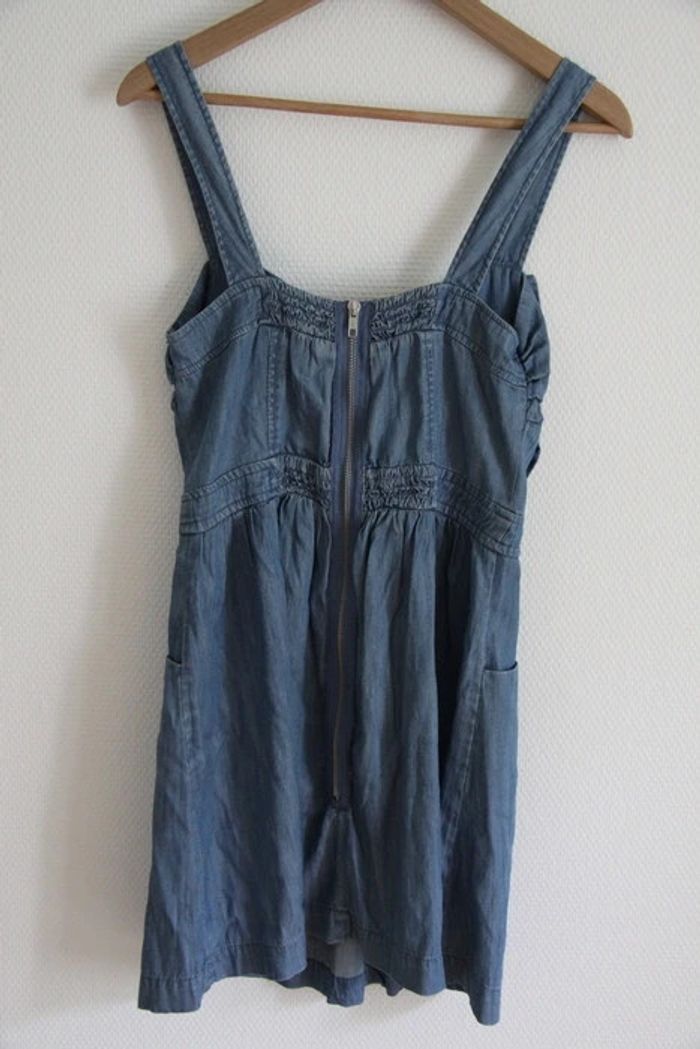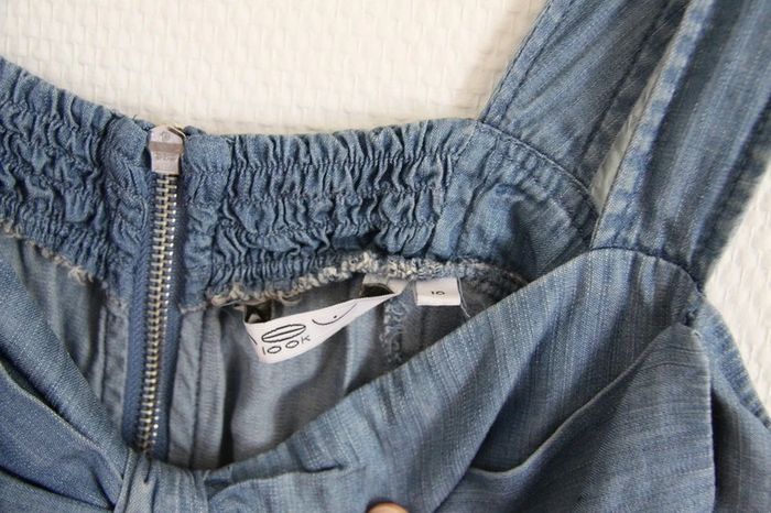 Robe en jean New Look avec grand nœud sur le devant Elle est de "couleur" jean, mais ce n'est pas du vrai jean, c'est un tissus assez léger. Deux poches de chaque côté. Le grand nœud permet de la porter sans soutien gorge, et sans que cela ne se voit ! Jamais portée. Juste lavée. Un des points qui tient le nœud était décousu à l'achat et a été recousu (invisible mais je précise quand même) Taille 10 UK, pour petit 38 ou 36 c_a7