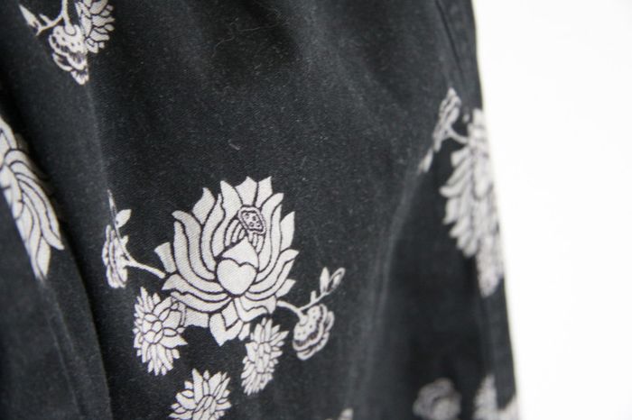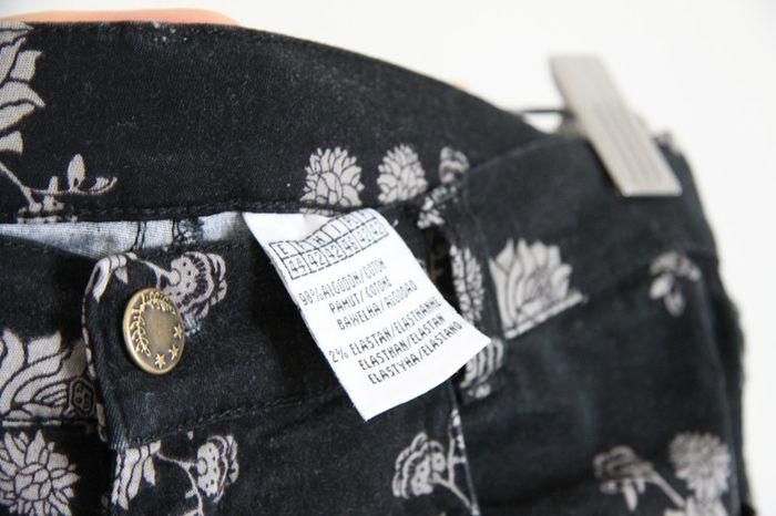 Très beau slim taille haute motifs fleuris noir et gris Taille indiquée : 42, mais peut aussi convenir à une plus petite taille pour un porté non moulant (je déconseille pour un vrai 42, je recommande plutôt pour un 38/40) Comme neuf, et de très bonne qualité, son seul défaut étant que la braguette a tendance à descendre une fois porté. 98% coton, 2% élasthanne Comme tous les vêtements noirs en coton, il accroche un peu les petites poussières. L'étiquette de la marque a été coupée. c_a4