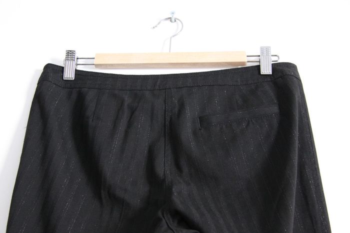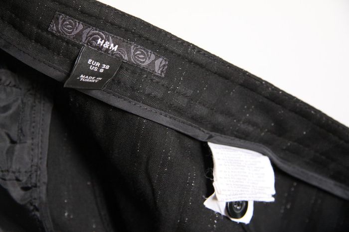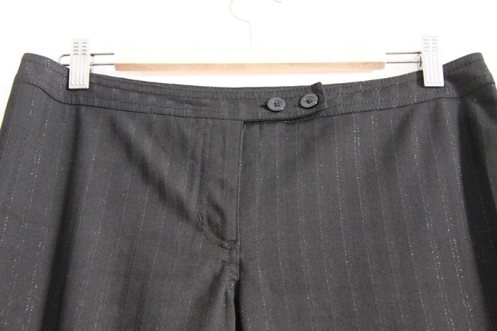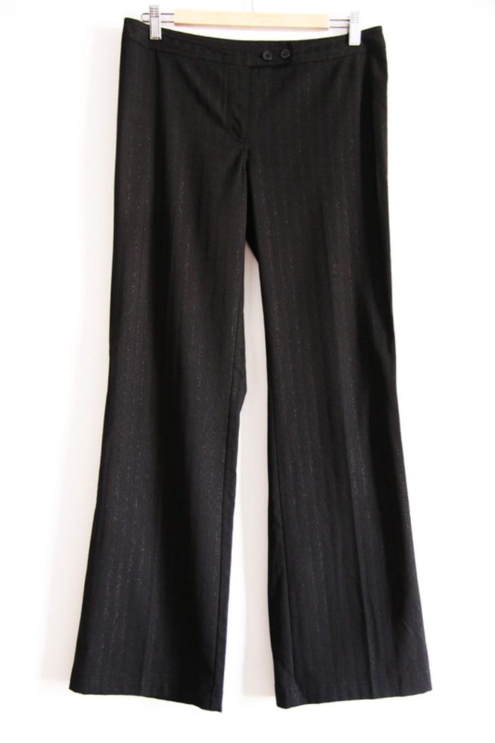 Pantalon ample noir "classe" H&M taille 38 A été porté mais bonne qualité, n'a pas "bougé" Style "classe" pour les fêtes ou le bureau, fines rayures argentées très discrètes. Un peu court pour 1m69. Fiez-vous aux dimensions indiquées ci-dessous pour être sûres qu'il soit à votre taille et qu'il taille comme vous le souhaitez : Dimensions 📏 Longueur totale : 101,5cm Entrejambe : 80,5cm Largeur taille : 40,5cm c_b1